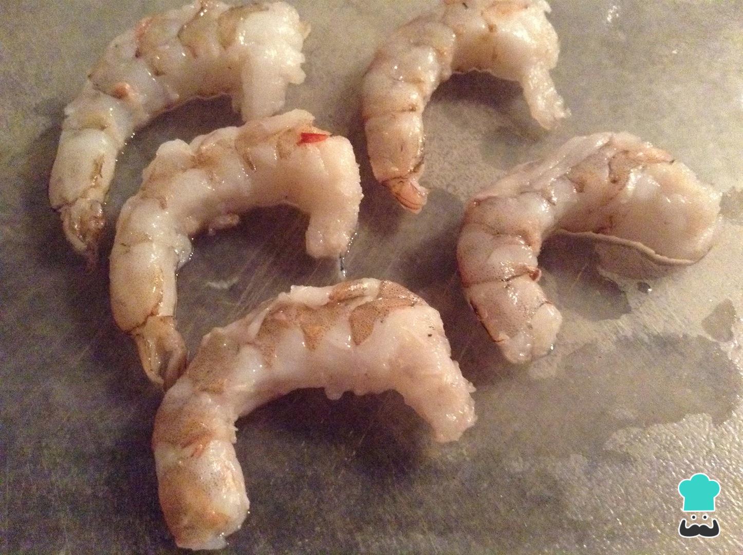 Primero debemos retirar el caparazón que recubre el langostino, luego realizamos una incisión en la parte del lomo de estos para retirar el intestino del animal.