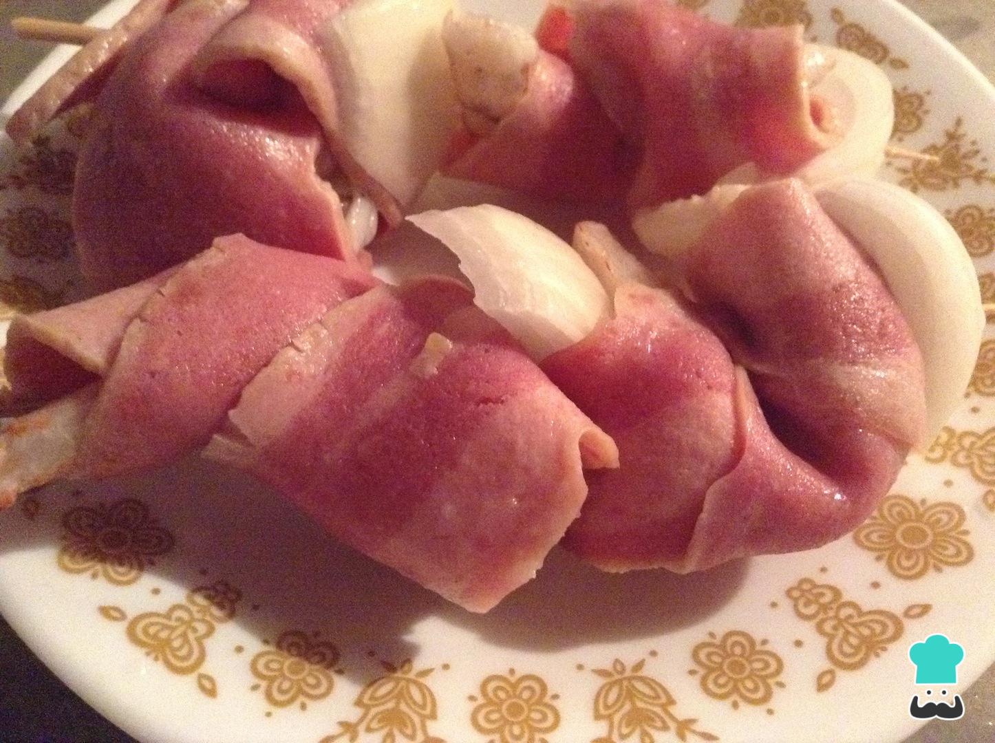 Lo ideal es que nuestras brochetas queden como se observa en la fotografía, si deseas también puedes añadir al lado de los cascos de cebolla blanca un cuadro de pimiento o pimentón rojo.