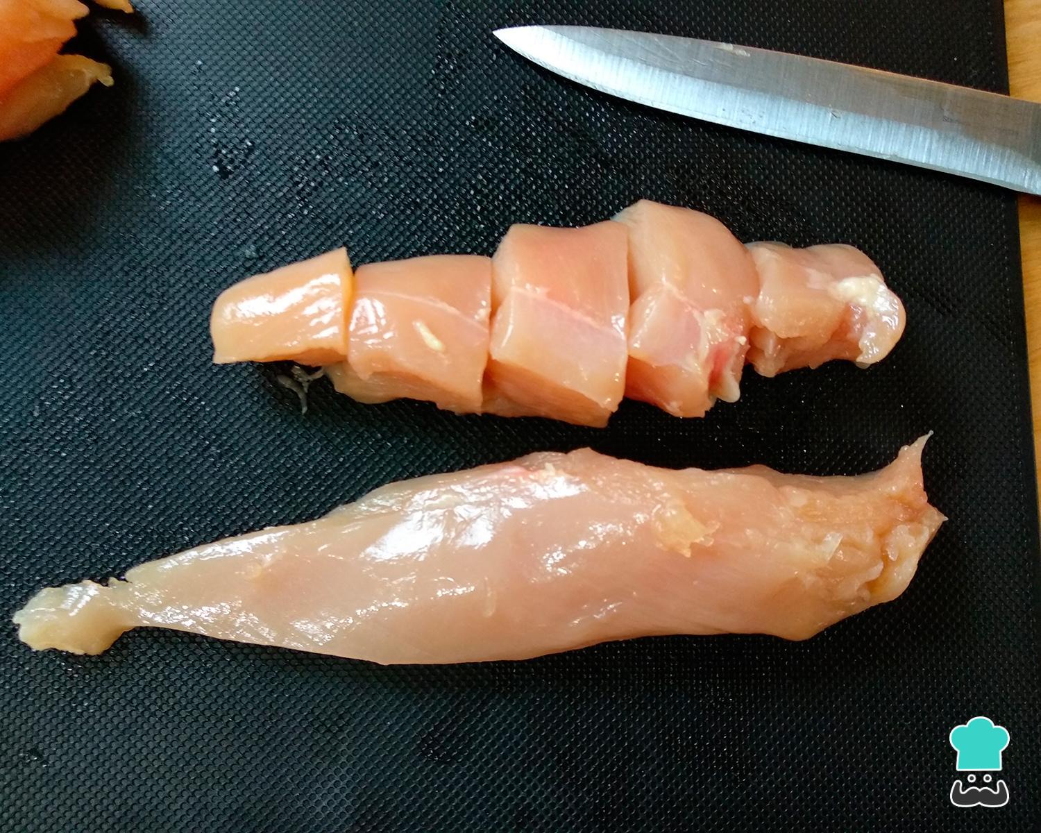Empieza preparando la carne para las brochetas de pollo con miel y limón. Para ello corta la pechuga por la mitad y luego en cubos del mismo tamaño más o menos.