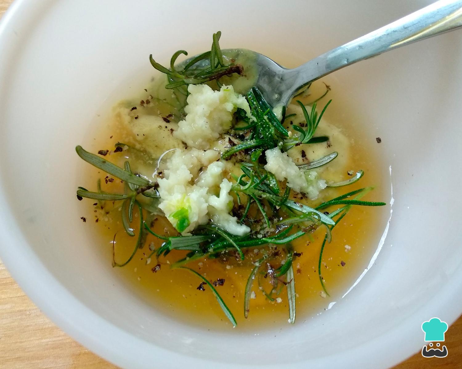 En un bol mezcla el resto de ingredientes para marinar los pinchos de pollo: mostaza, miel, jugo de limón, ajo, romero y pimienta negra. Reserva la sal para condimentar la carne justo antes de hornearla.