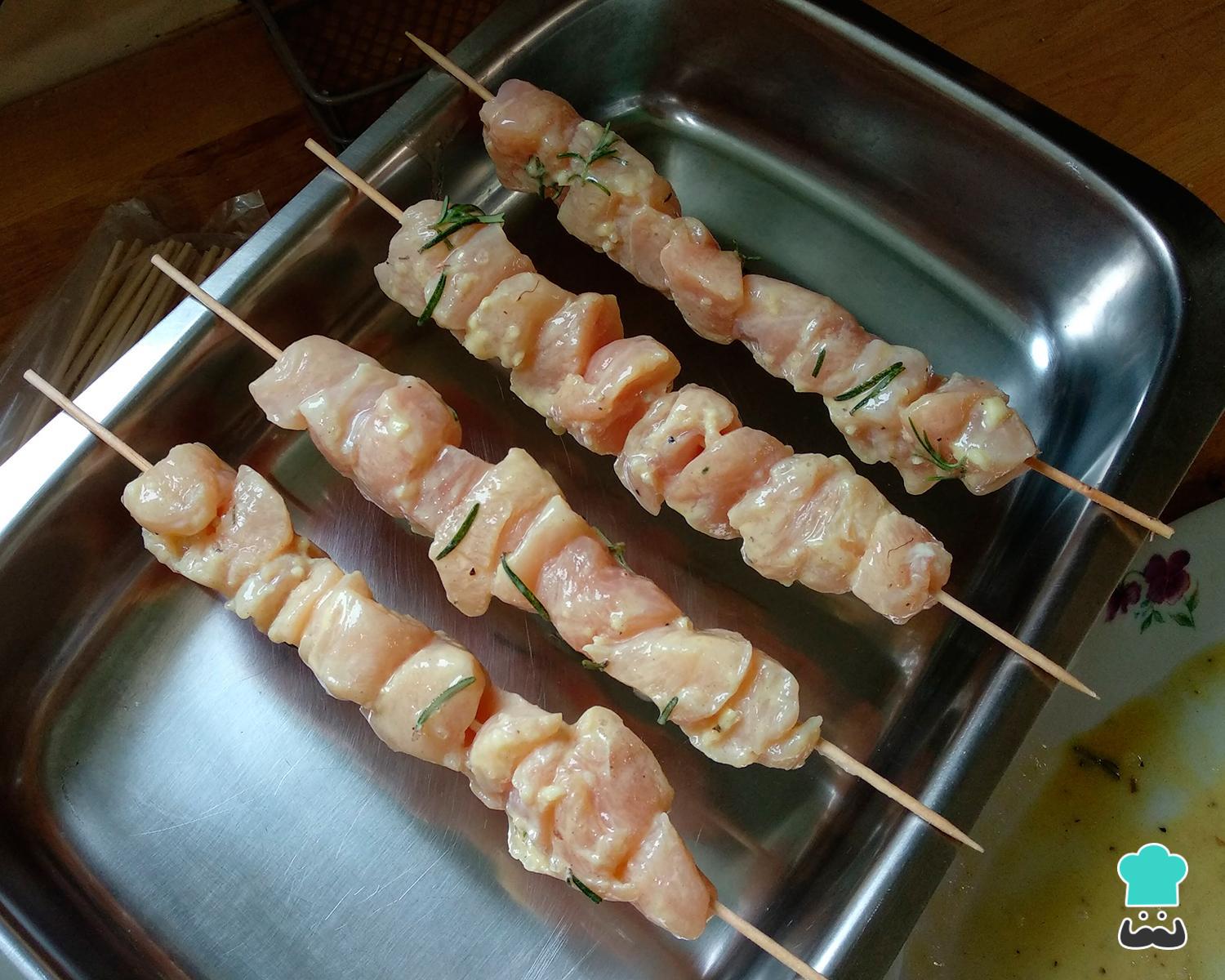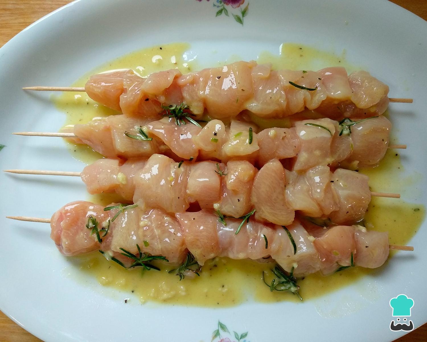 Coloca los trozos de carne en los palitos de madera y vierte encima de las brochetas de pollo con mostaza y limón la salsa preparada en el paso anterior. Cubre el plato con papel film y déjalas reposar durante 2 horas para que cojan sabor.