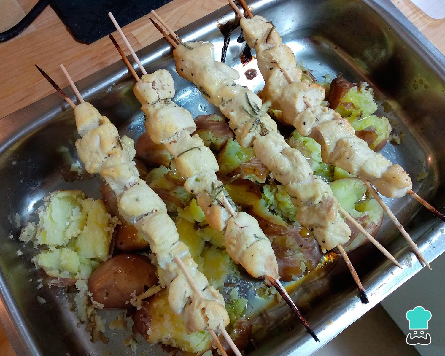 Después de ese tiempo saca las brochetas de pollo del horno y rocíalas con la salsa que ha quedado en la bandeja. Puede aprovechar la misma fuente para poner una patatas en gajos al horno para que se hagan al mismo tiempo y sirvan de acompañamiento por ejemplo. Hornea durante 5-10 minutos más.