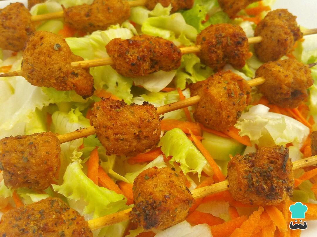 Después del tiempo de reposo cogemos las bolitas de soja y las pinchamos en los palitos para las brochetas. Como opción, podemos alternarlas con trozos de verdura (cebolla, pimiento, zanahoria, etc.) y así obtener unos pinchitos veganos muy sabrosos.