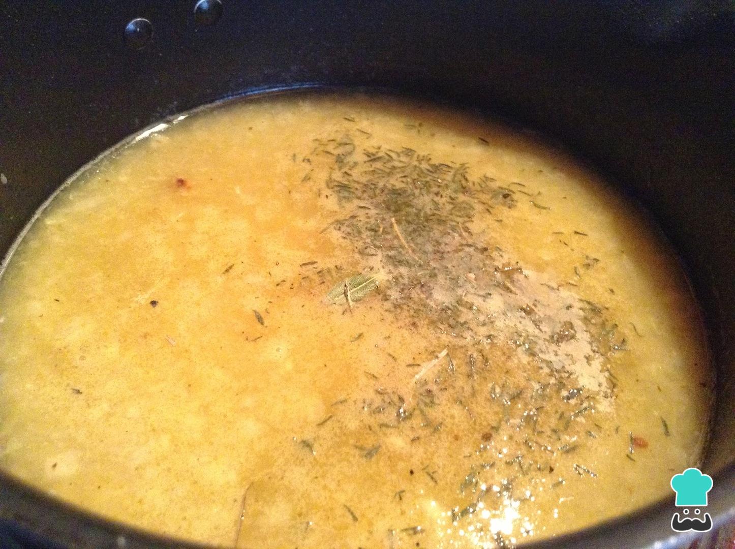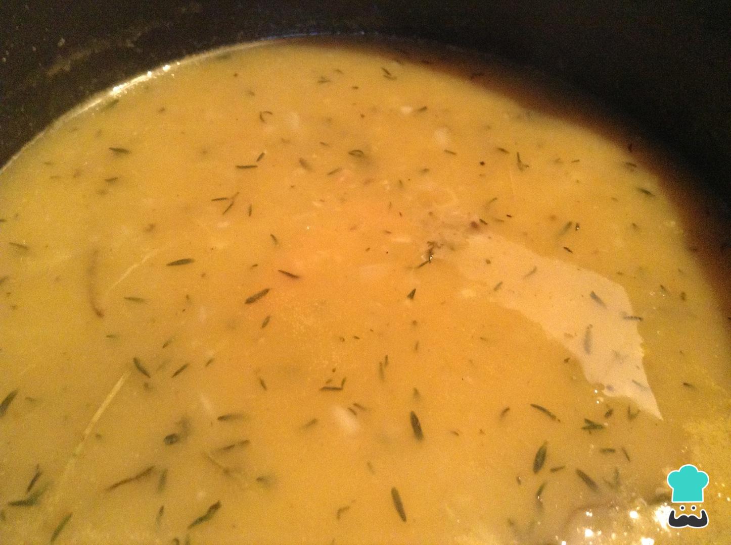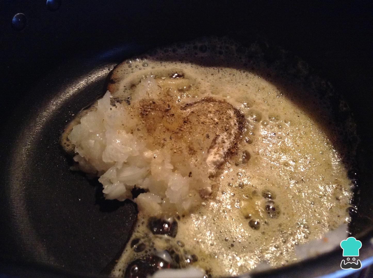 Lleva una olla a fuego medio, adiciona la mantequilla y cebolla blanca finamente picada y dora durante algunos minutos. Luego, agrega la harina de trigo hasta formar una pasta.