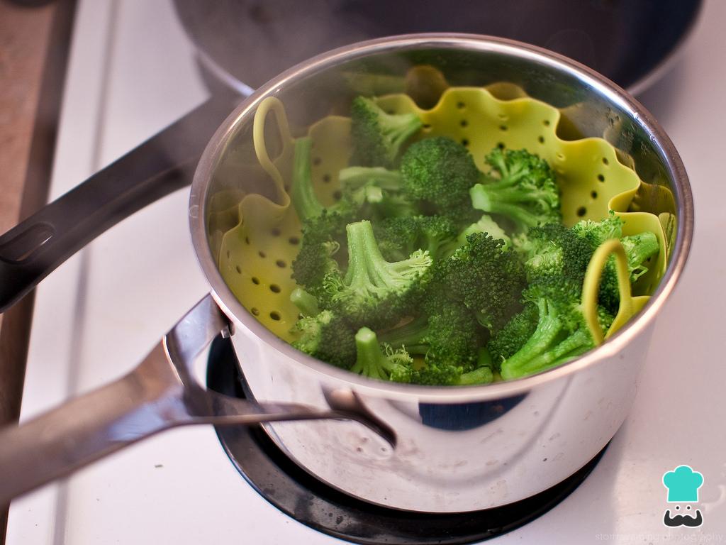 Pon una olla con agua y llévala a ebullición. Cuando hierva coloca un colador, en este caso de silicona y cocina el brócoli al vapor durante unos 10 minutos aproximadamente hasta que esté blando.