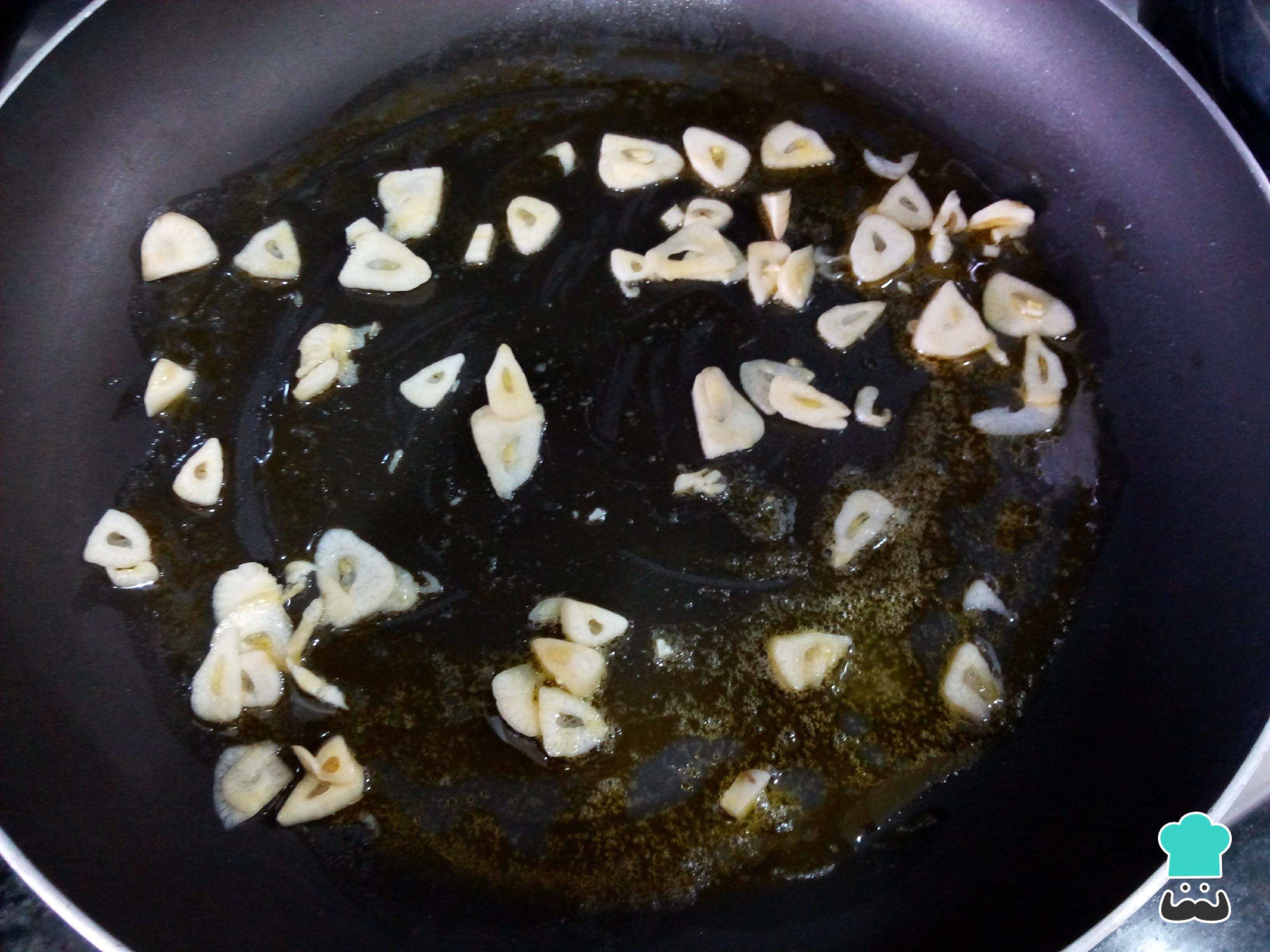Mientras tanto, pela y lamina los ajos finamente como si fueran chips de verduras. Luego dóralos en una sartén con un chorrito de aceite cuando esté caliente pero ten cuidado de que no se quemen, retíralos y reserva.