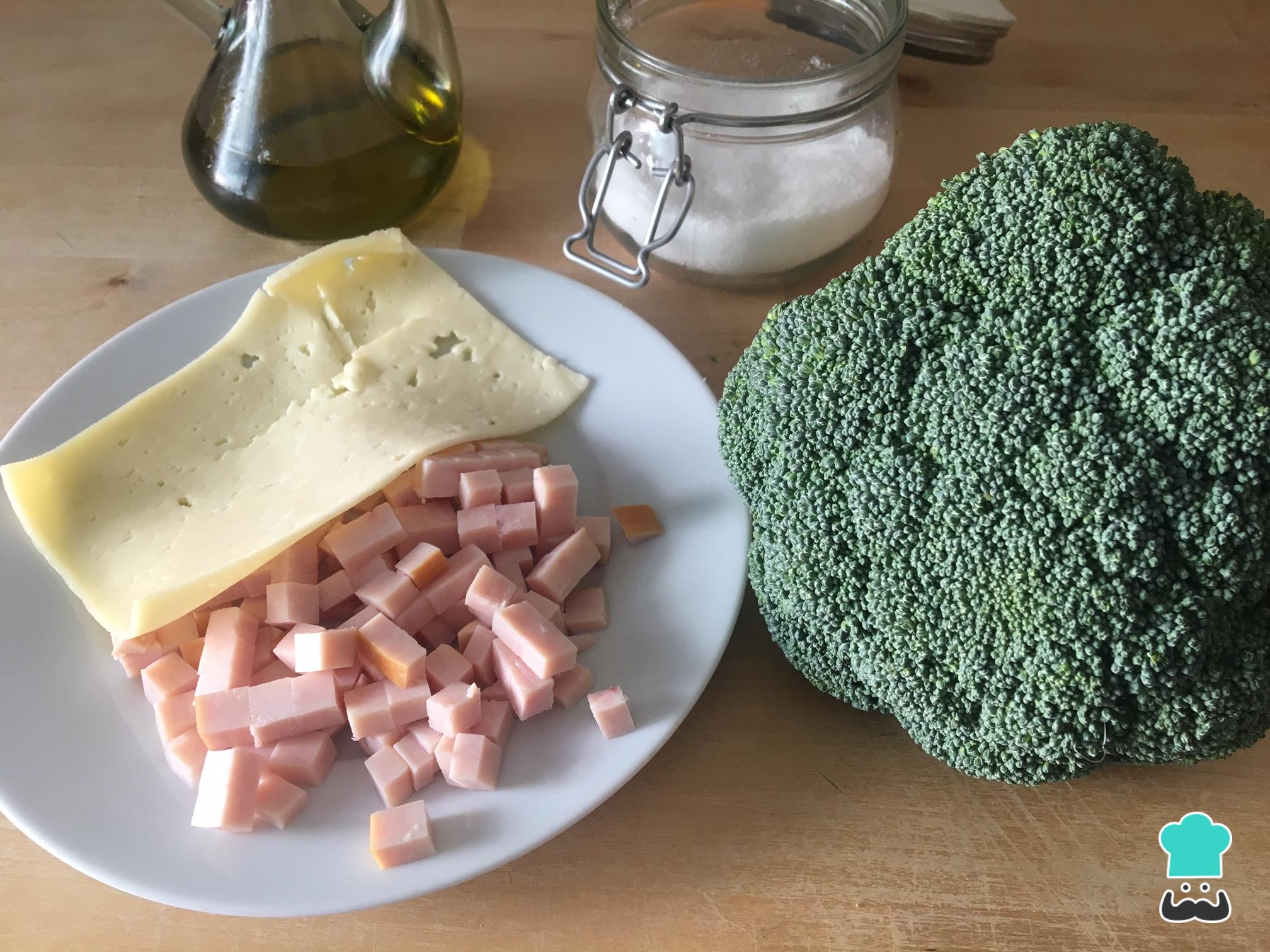 Reunimos todos los ingredientes para preparar el brócoli al horno con queso y jamón.