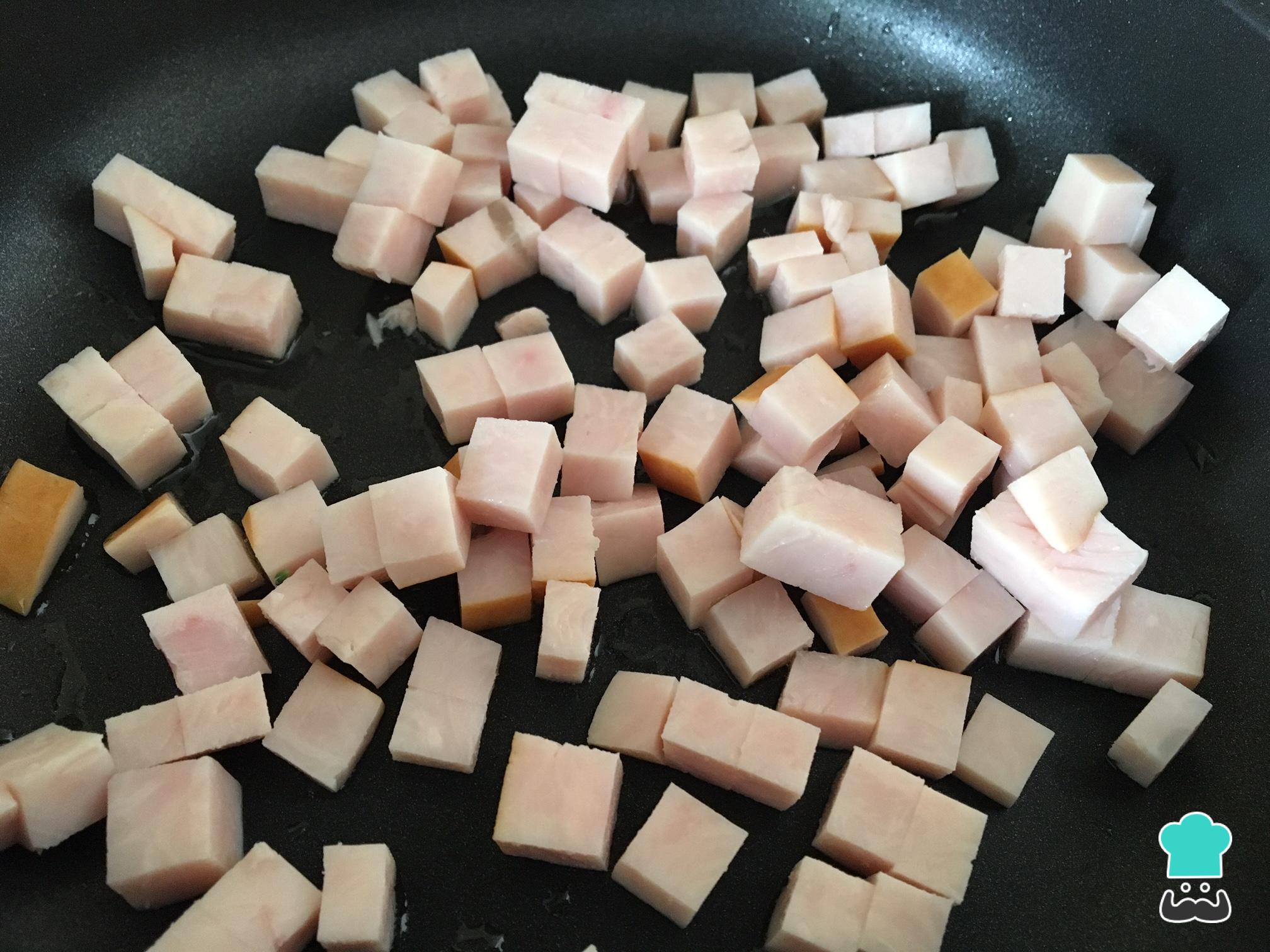 En una sartén salteamos el jamón york cortado en cuadraditos del tamaño que indicamos en la imagen. De este modo, el jamón queda más sabroso.