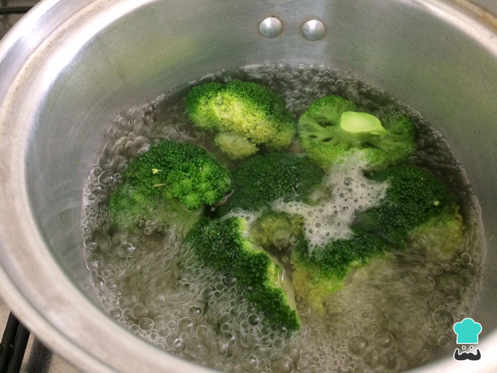 En una olla con agua hirviendo, cocina los arbolitos de brócoli durante 15 minutos hasta que estén blandos, escúrrelos y reserva.
