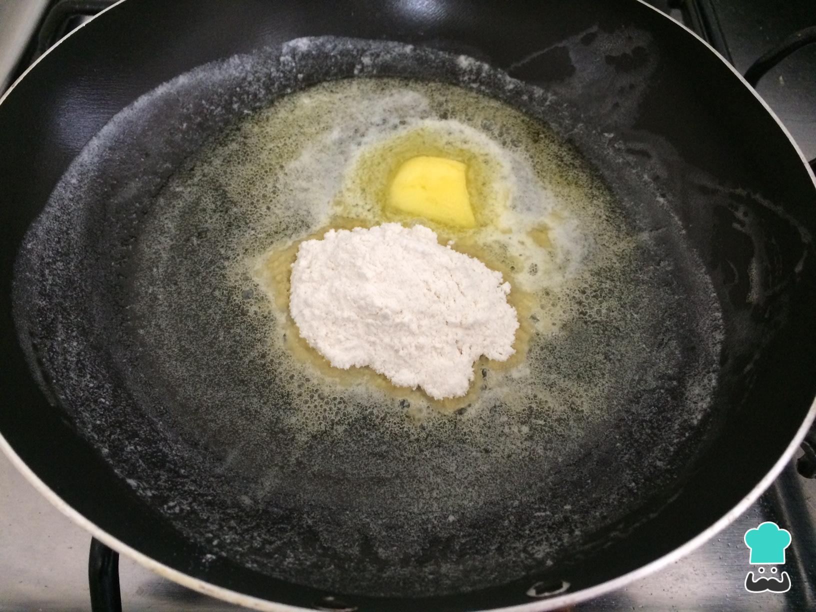 Aparte, para hacer la salsa bechamel que acompañará a la receta de brócoli con queso, calienta una sartén con mantequilla hasta que se derrita. Agrega la harina y cocínala a fuego bajo hasta que esté dorada.
