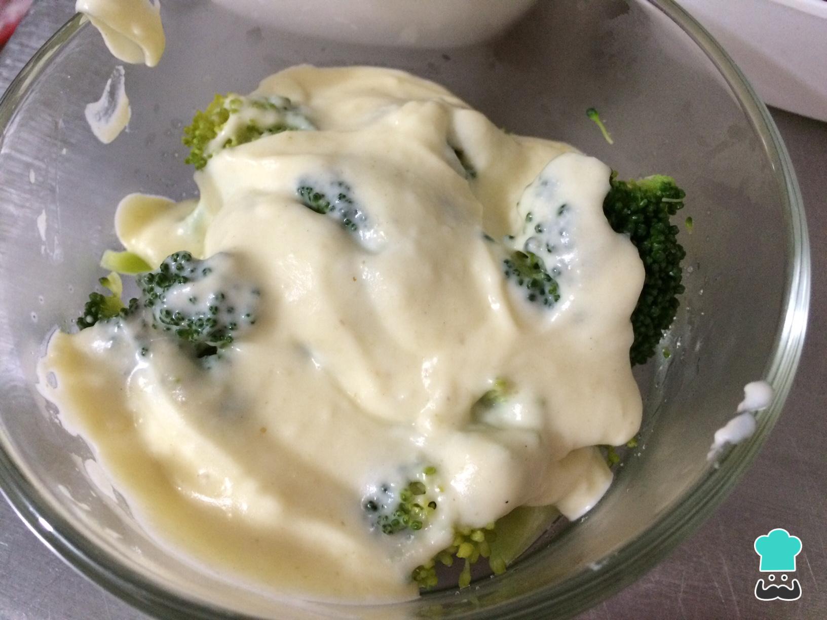 En una refractaria agrega los árboles de brócoli, salpimienta y sobre ellos vierte la salsa bechamel.