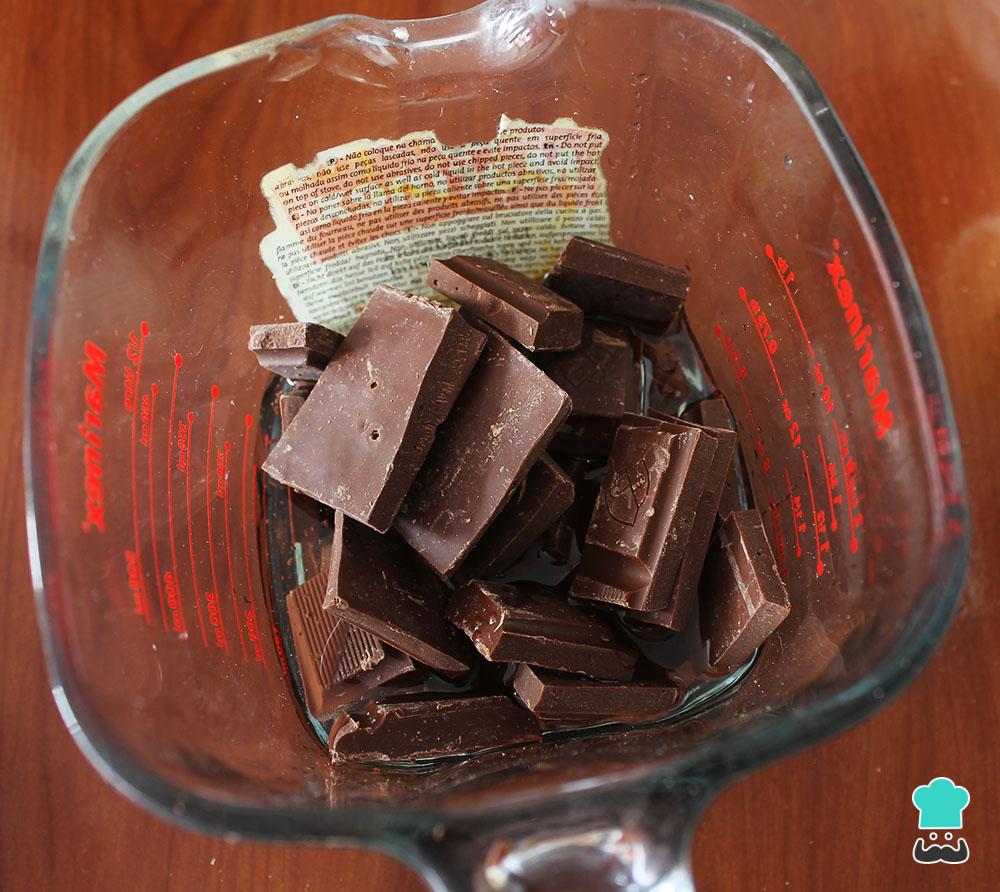 Aparte, colocar el chocolate en trozos y el aceite en un recipiente para microondas y llevar a derretir el chocolate a máxima potencia por intervalos de 30 segundos hasta que esté completamente derretido. Dejar enfriar.