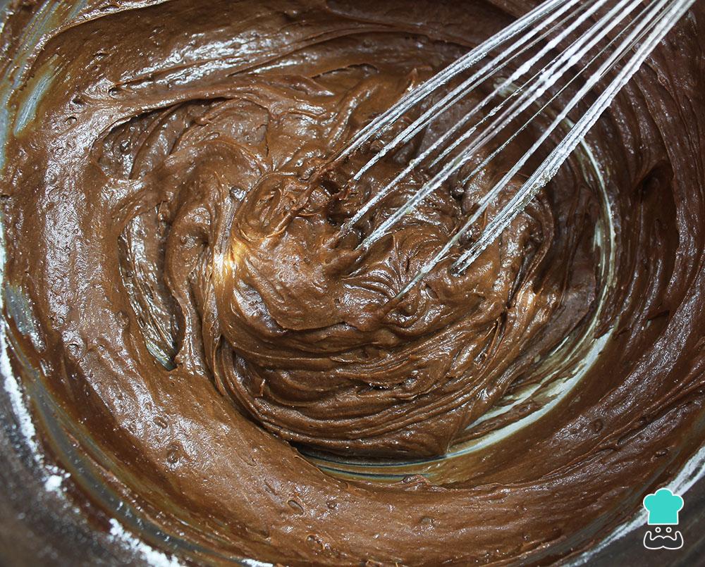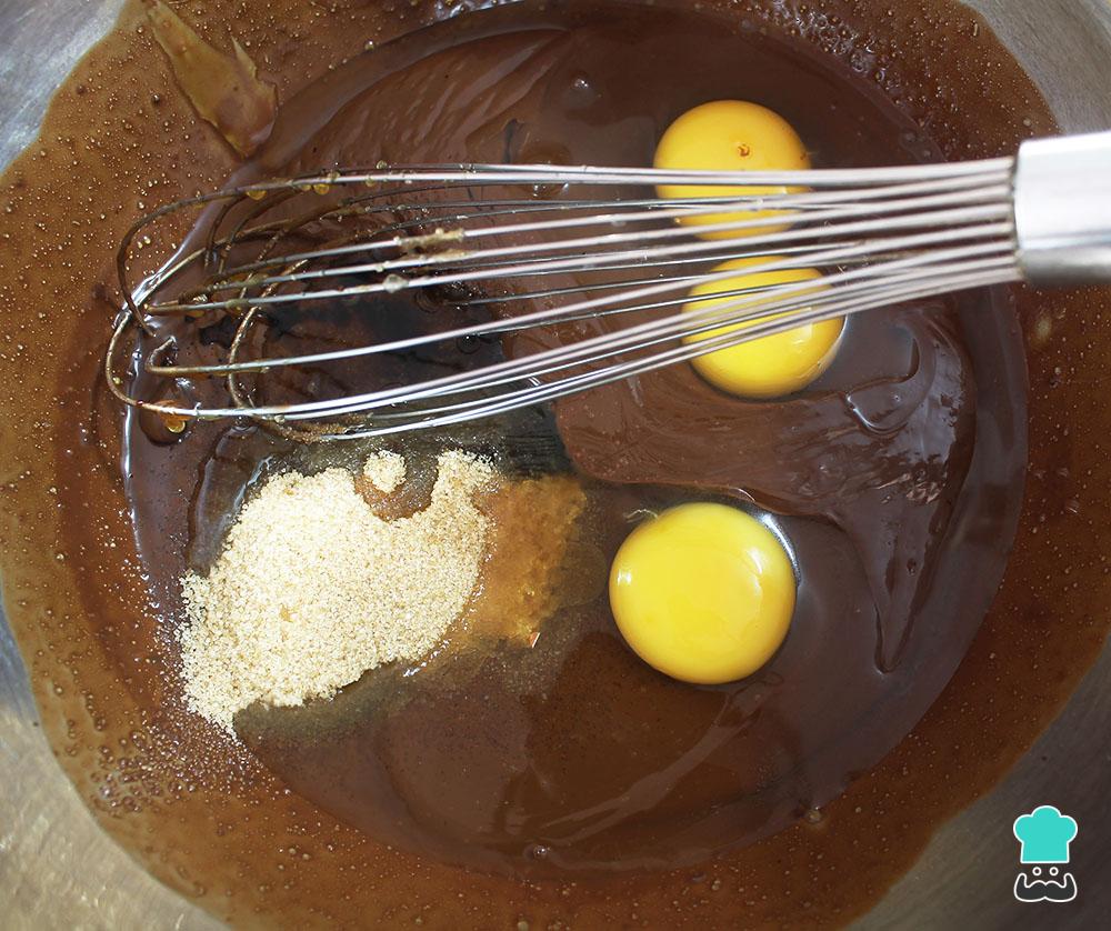 Cuando haya enfriado la mezcla de chocolate, añadir los huevos, el azúcar rubia y la esencia de vainilla. Remover todo hasta homogeneizar la masa del brownie de chocolate y cacahuetes.