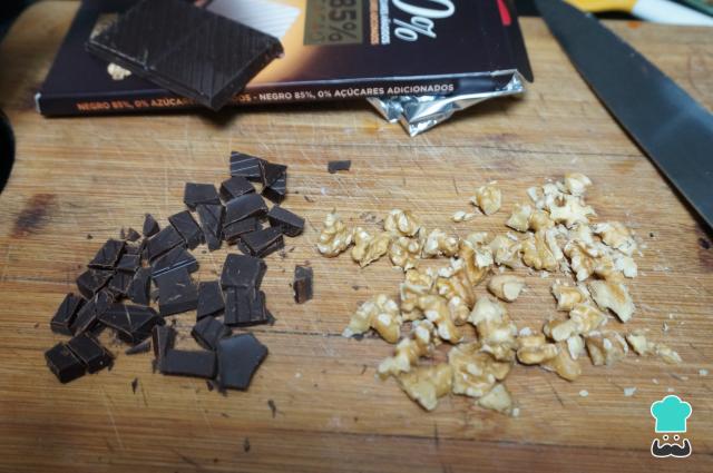 Pela y pica las nueces en trozos pequeños. Seguido, prepara las pepitas de chocolate, si no dispones de ellas, puedes picar trozos de chocolate de 85% de chocolate sin azúcar.