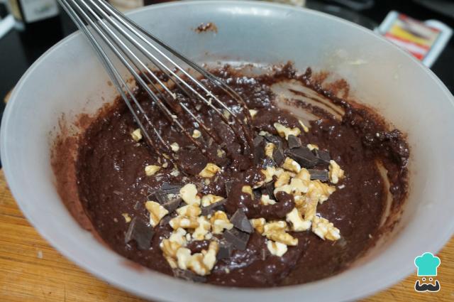 Añade los trozos de chocolate picados a la masa y unas cuantas nueces también picadas. Deja algunas nueces para añadir encima del bizcocho. Mezcla todo.