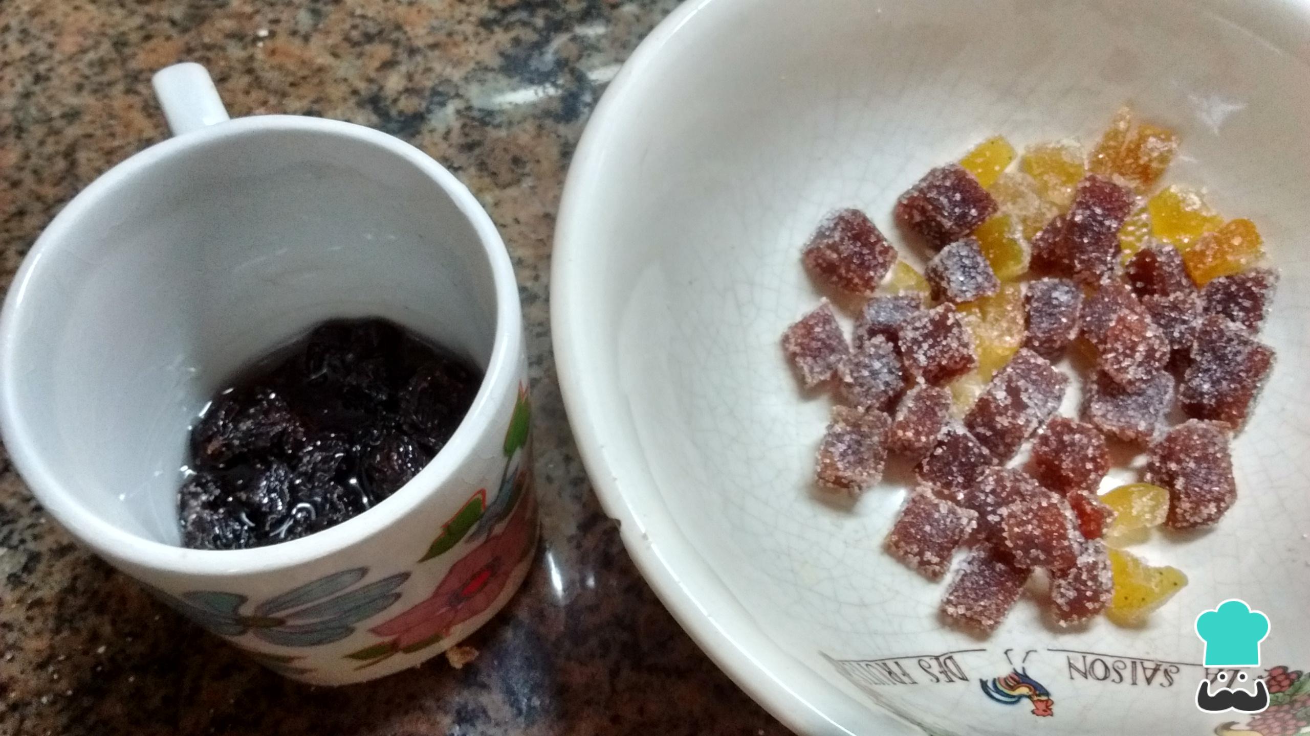 El primer paso para la preparación del budín con frutas es hidratar las pasas de uva con el licor de naranja. De esta forma, tomarán un sabor delicioso y le aportarán mucha humedad al budín. Por otro lado, prepara las frutas abrillantadas, en este caso, cascaritas de naranja y membrillo. Recomendamos los pases por azúcar si no tienen suficiente a su alrededor. Resérvalas.