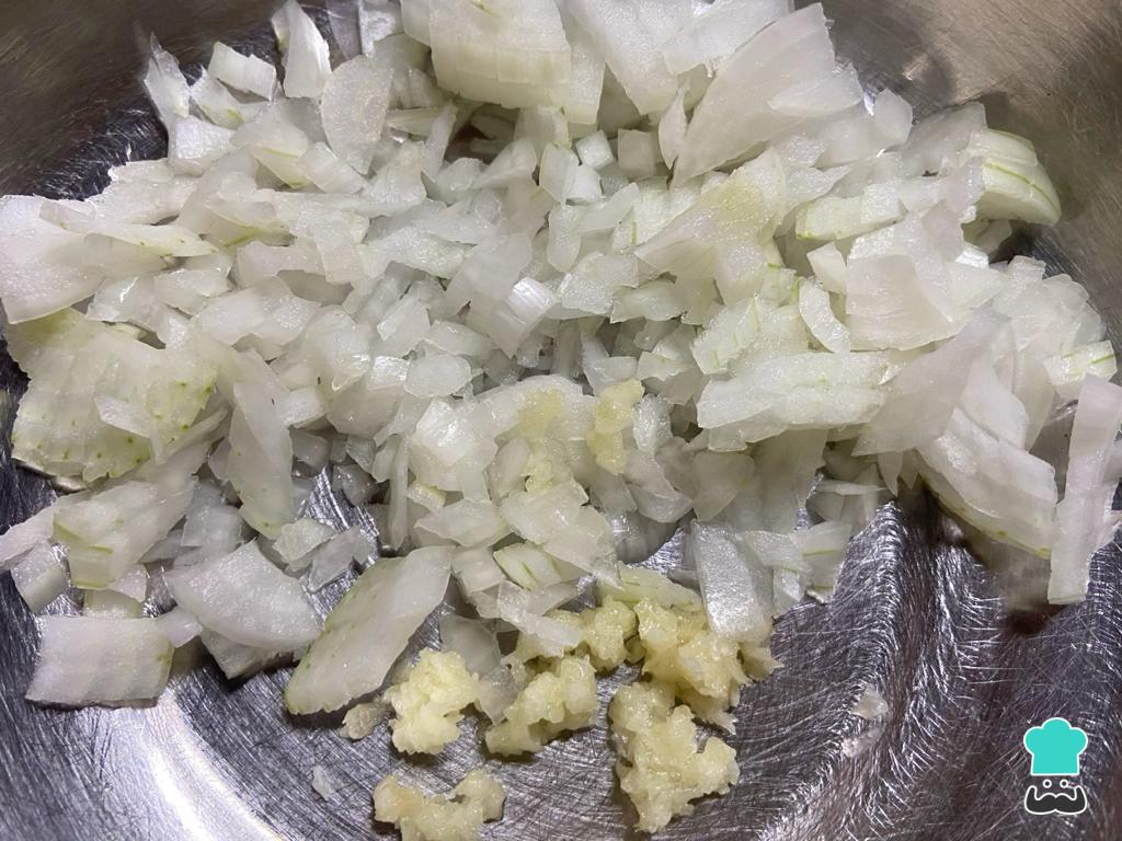 Pela y pica lo más chiquito posible la cebolla y el ajo. Coloca ambos ingredientes en un recipiente.