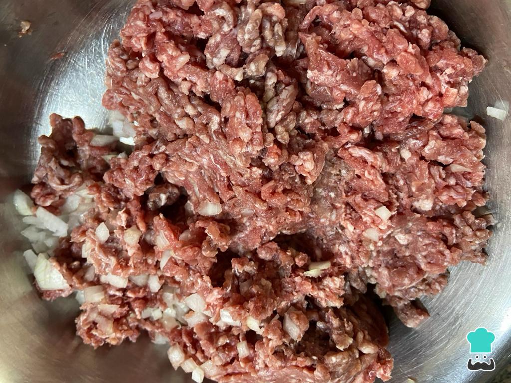 Añade la carne molida y comienza a integrar con la cebolla y el ajo.