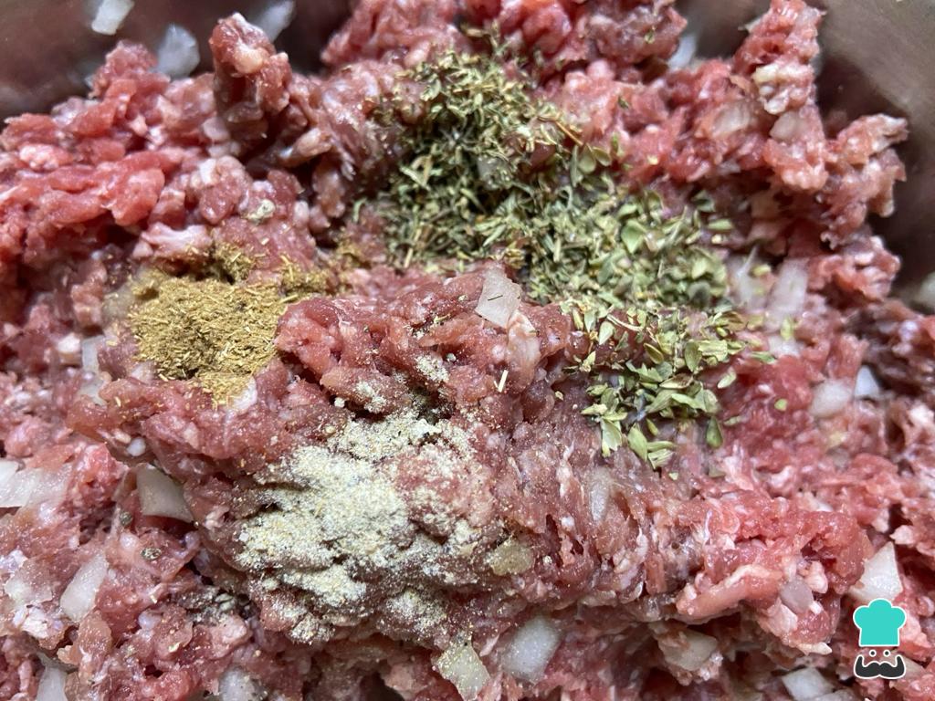 Condimenta con sal, pimienta, comino y tomillo al gusto, amasa con las manos por unos 5 minutos. De esta manera, no será necesario agregar huevo para que el budín quede compacto, ya que el colágeno de la carne se encargará de amalgamar los ingredientes y de formar una especie de masa.