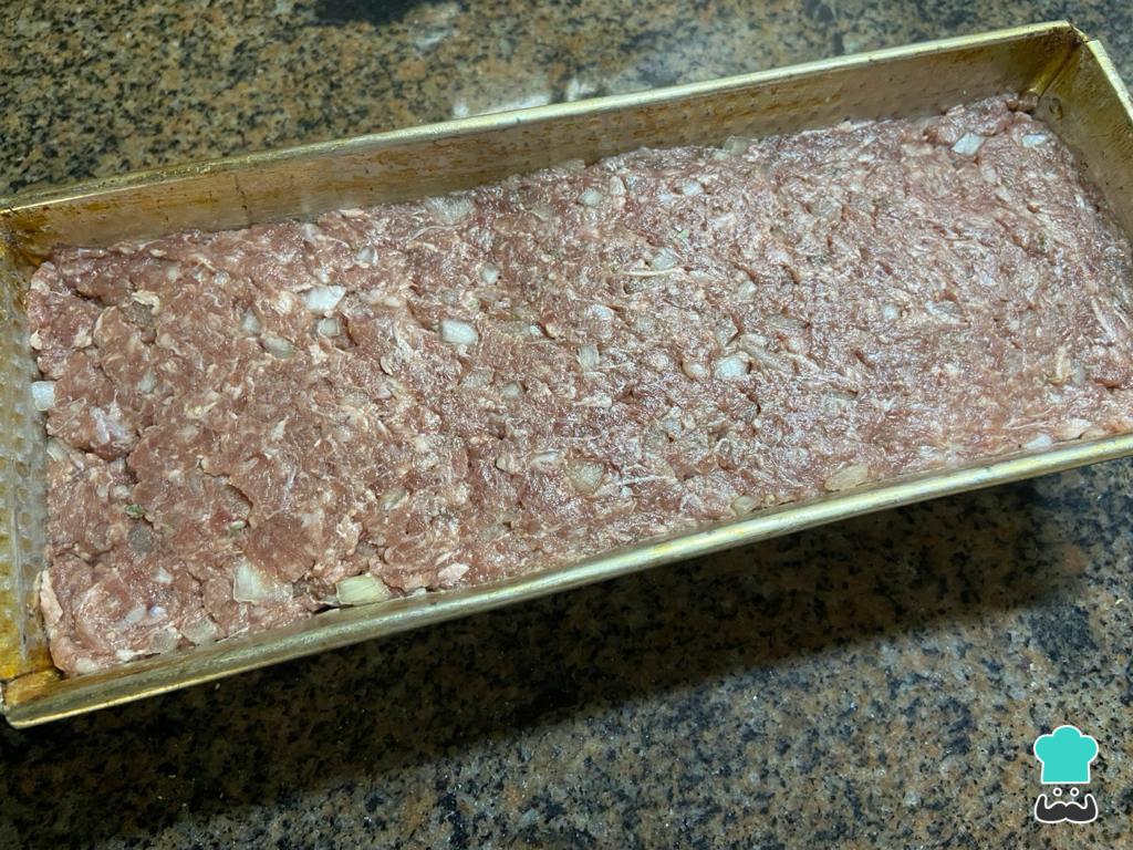 Distribuye la masa de carne en la budinera de manera uniforme y aplasta un poco con las mismas manos o con el revés de una cuchara. Lleva el budín al horno precalentado a 180 °C por aproximadamente 35/40 minutos.