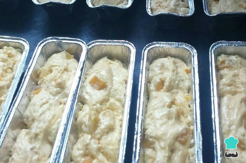 Vaciamos la mezcla de nuestro budín de durazno casero en los moldes, previamente engrasados y espolvoreados con harina, para luego decorar con los gajos de fruta que hemos reservado.