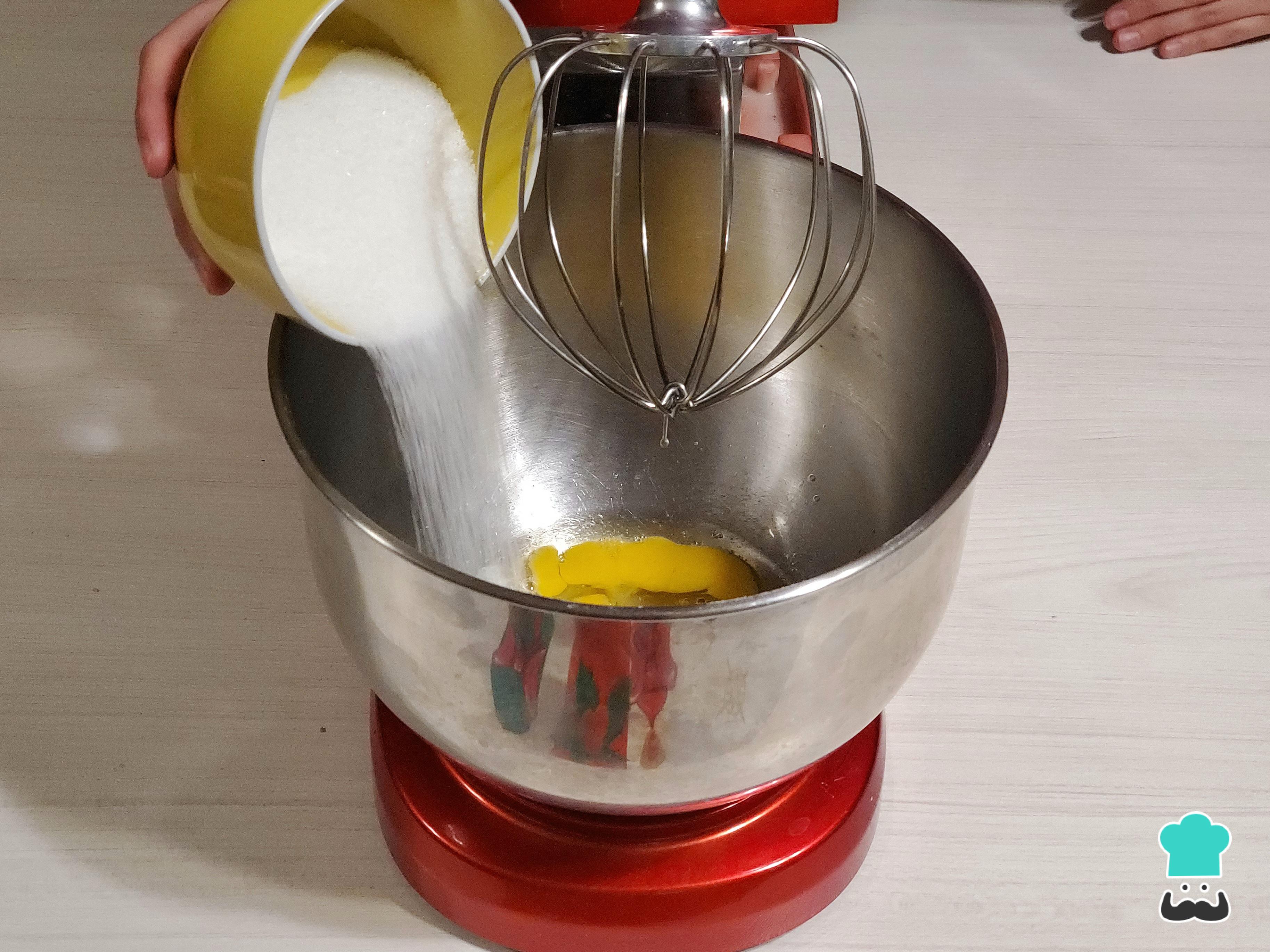 Empieza colocando los huevos a temperatura ambiente en el bowl de la batidora. Incorpora el azúcar y bate a máxima velocidad durante unos 7 minutos hasta que tripliquen su volumen, adquieran un color amarillo pálido y lleguen a punto de cinta o letra (esto significa que al levantar un poco de masa y dejarla caer, debe formar un trazo que permanezca visible por unos segundos).