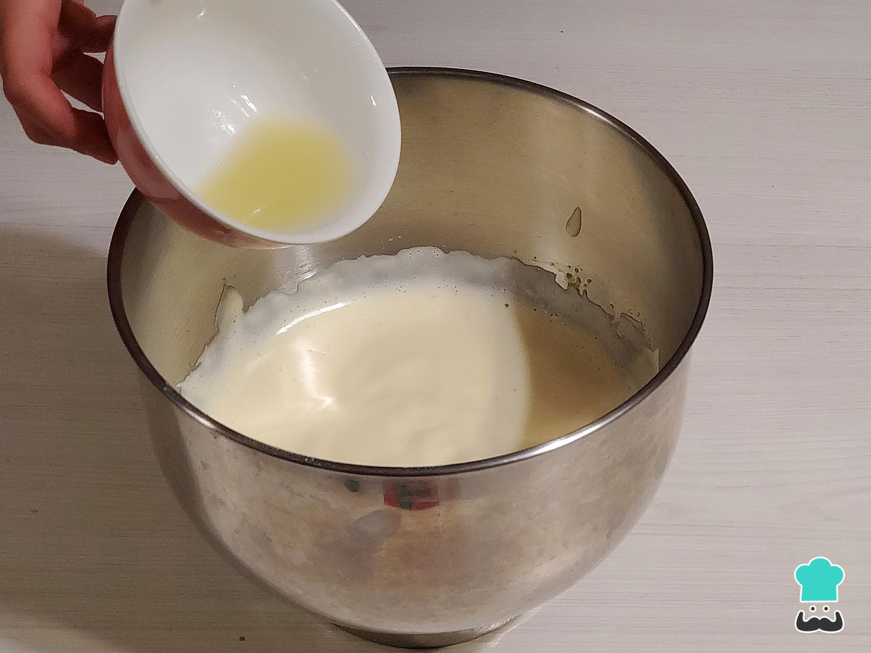 Derrite la mantequilla o si prefieres, reemplázala por el aceite de tu elección, como aceite de oliva o de coco. Incorpora a la mezcla continuando con los movimientos envolventes.