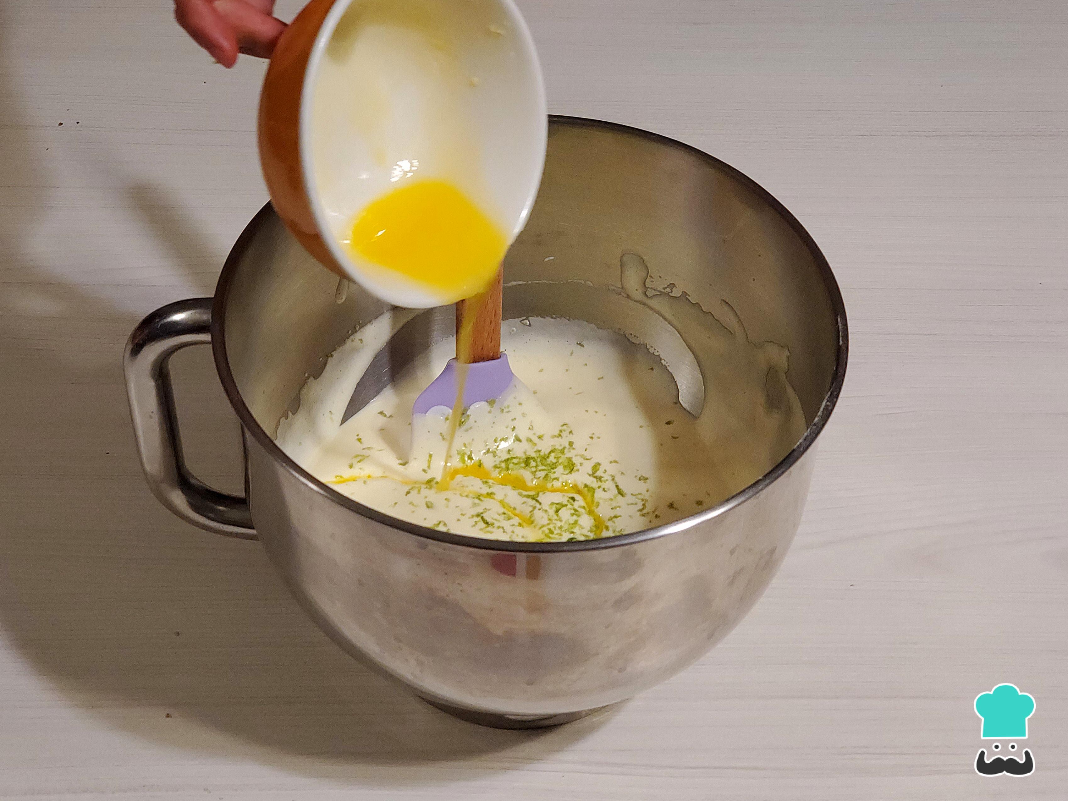 Exprime los limones y añade el jugo a la mezcla de huevos mezclando con una espátula de goma en movimientos envolventes. Esto se hace moviendo la espátula de arriba hacia abajo en círculos mientras rotas el bowl.