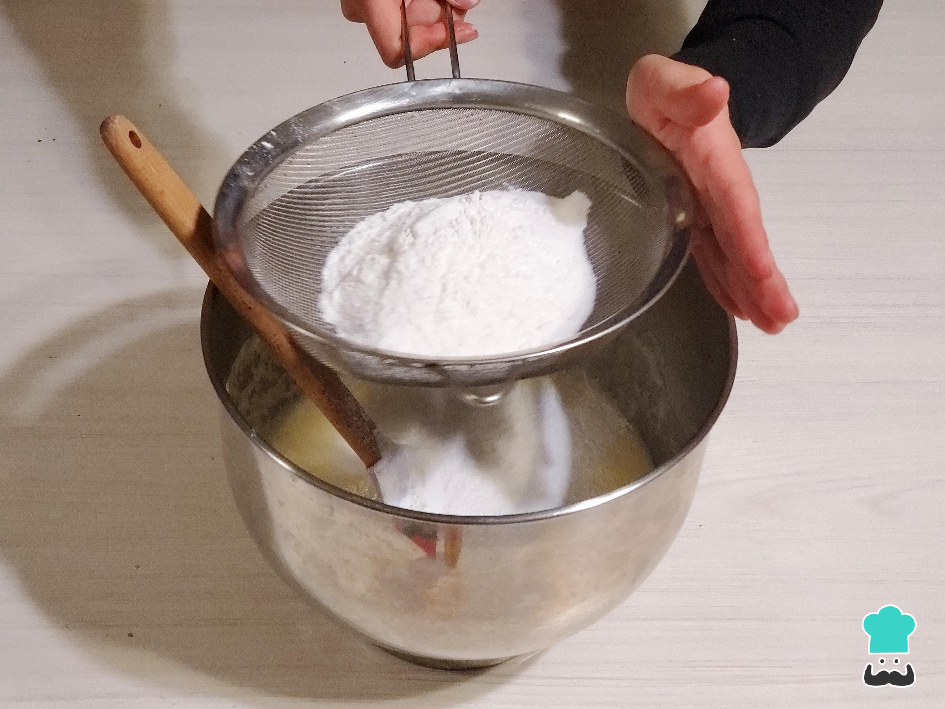 Por último, cierne los ingredientes secos, que son la premezcla sin TACC y el polvo de hornear.