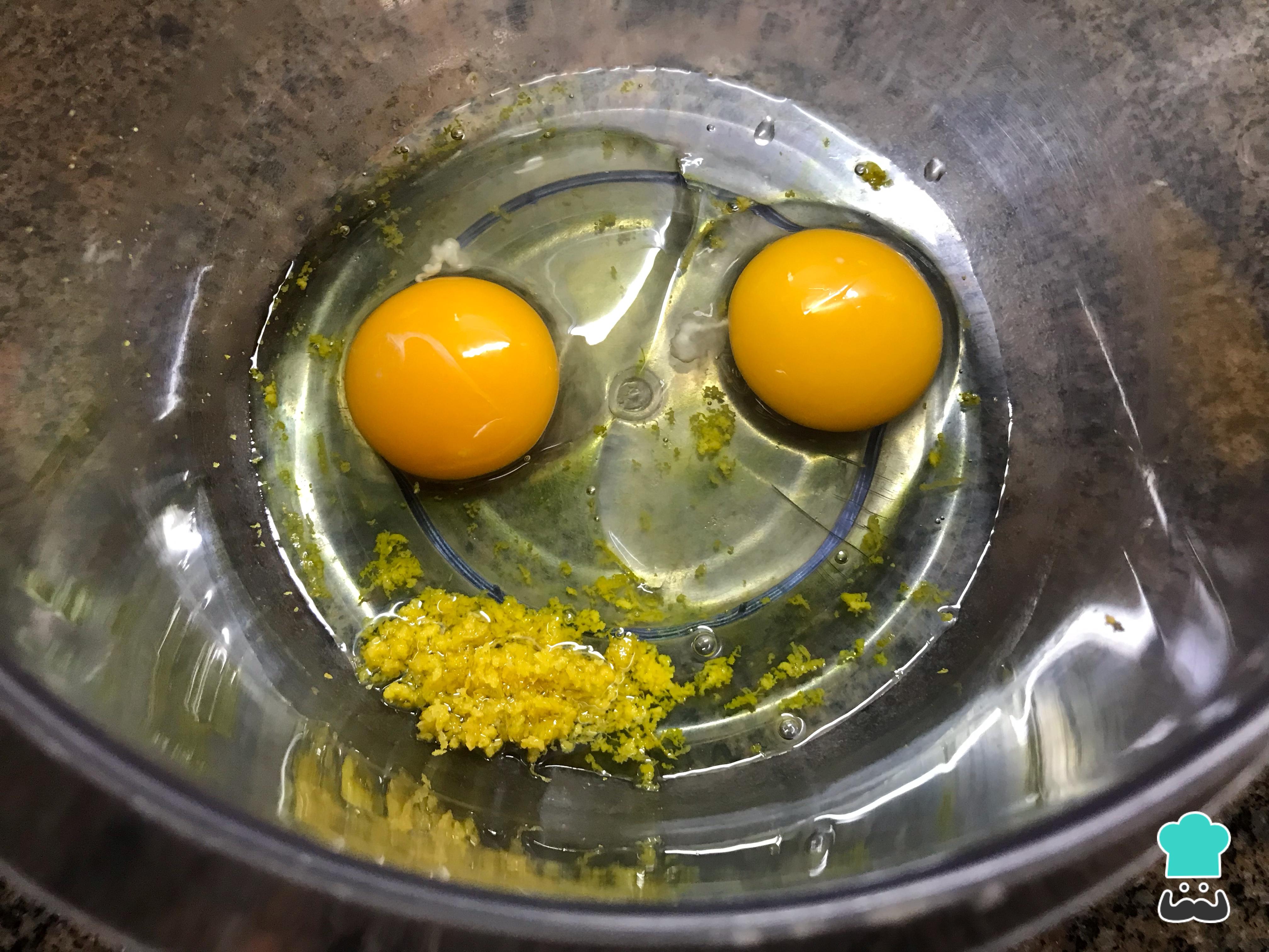 Coloca los 2 huevos en el bol de la batidora y, luego, lava bien el limón y ralla la piel. A continuación, coloca la ralladura en el bol junto con los huevos.