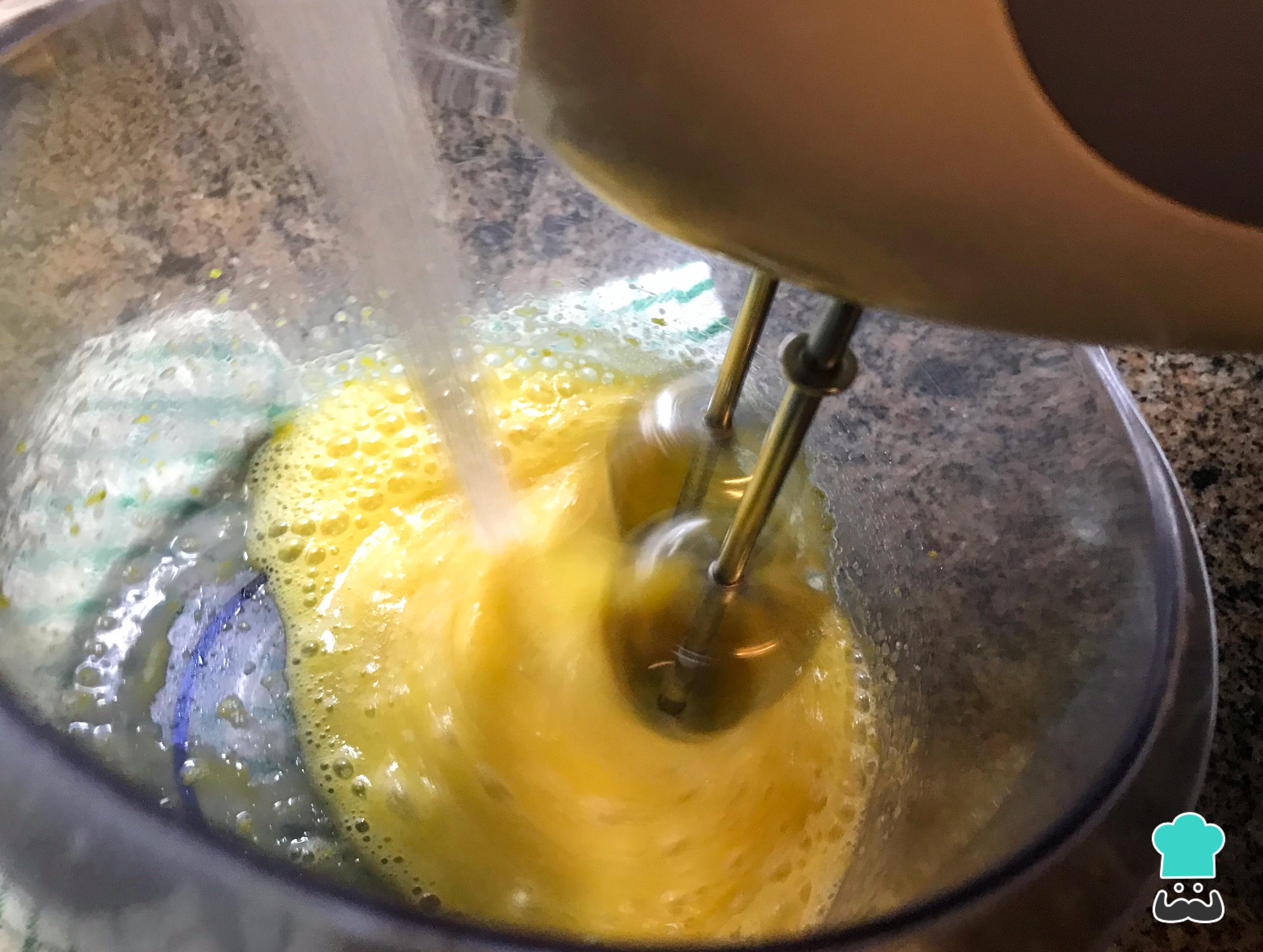Comienza a batir y, mientras bates, agrega una pizca de sal y azúcar en forma de lluvia. Luego, añade el aceite en forma de hilo y sigue batiendo hasta obtener una preparación esponjosa y con un color más claro.