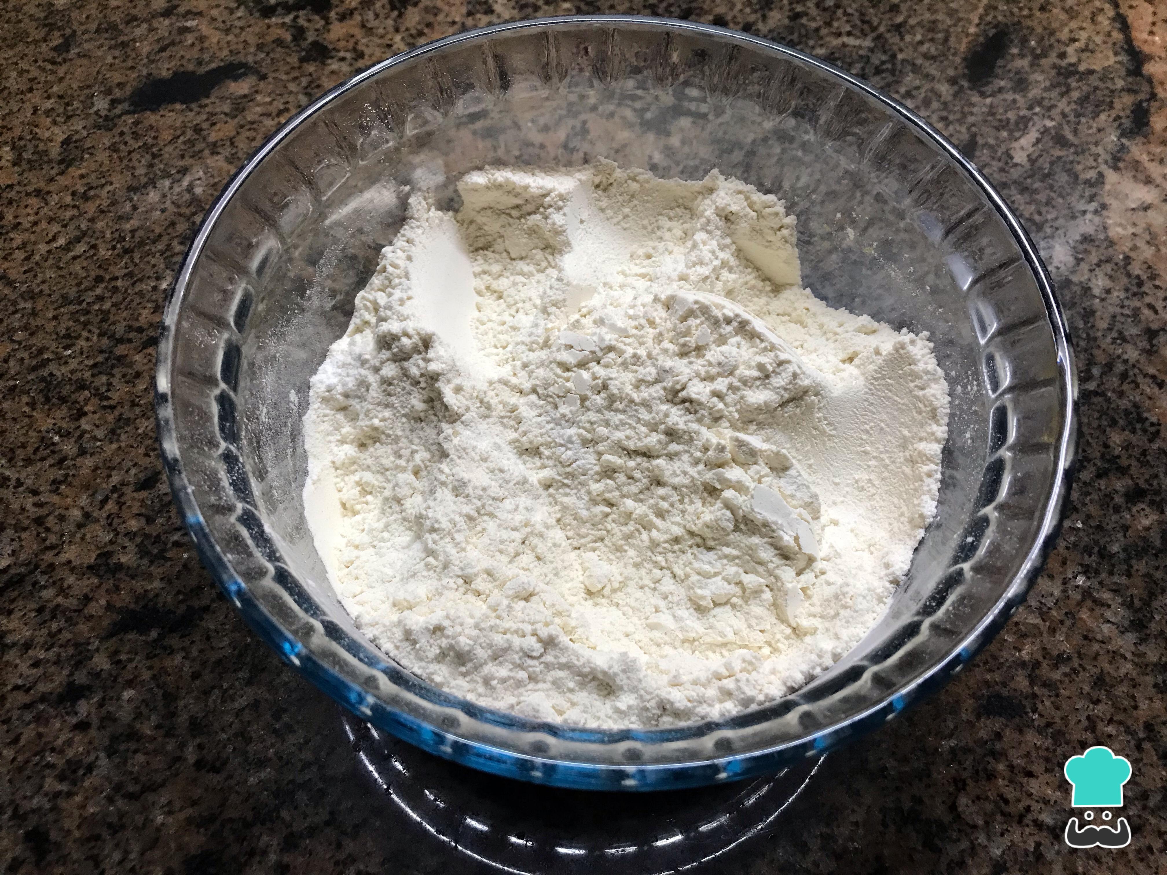 En otro recipiente, mezcla la harina tamizada con el polvo para hornear y el bicarbonato de sodio.
