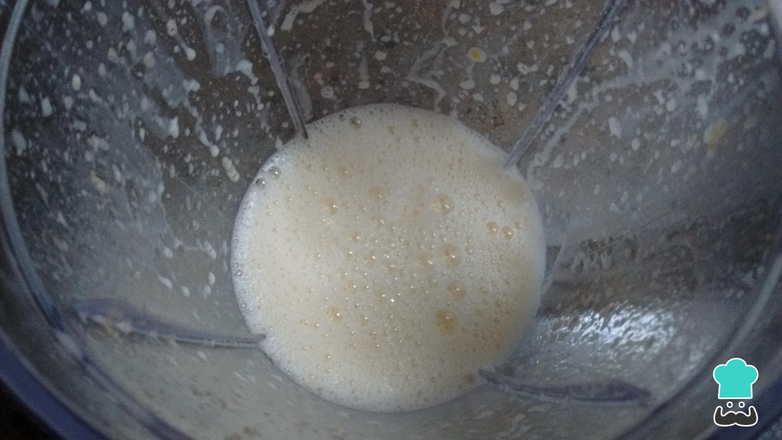 El primer paso para hacer este budín de mandarina esponjoso sin azúcar es procesar la mandarina, sin sus hollejos mas gruesos, piel y semillas, junto con el aceite, el huevo y el agua o la leche. Procesa estos ingredientes hasta que estén bien desintegrado y espumoso, como ves en la imagen.
