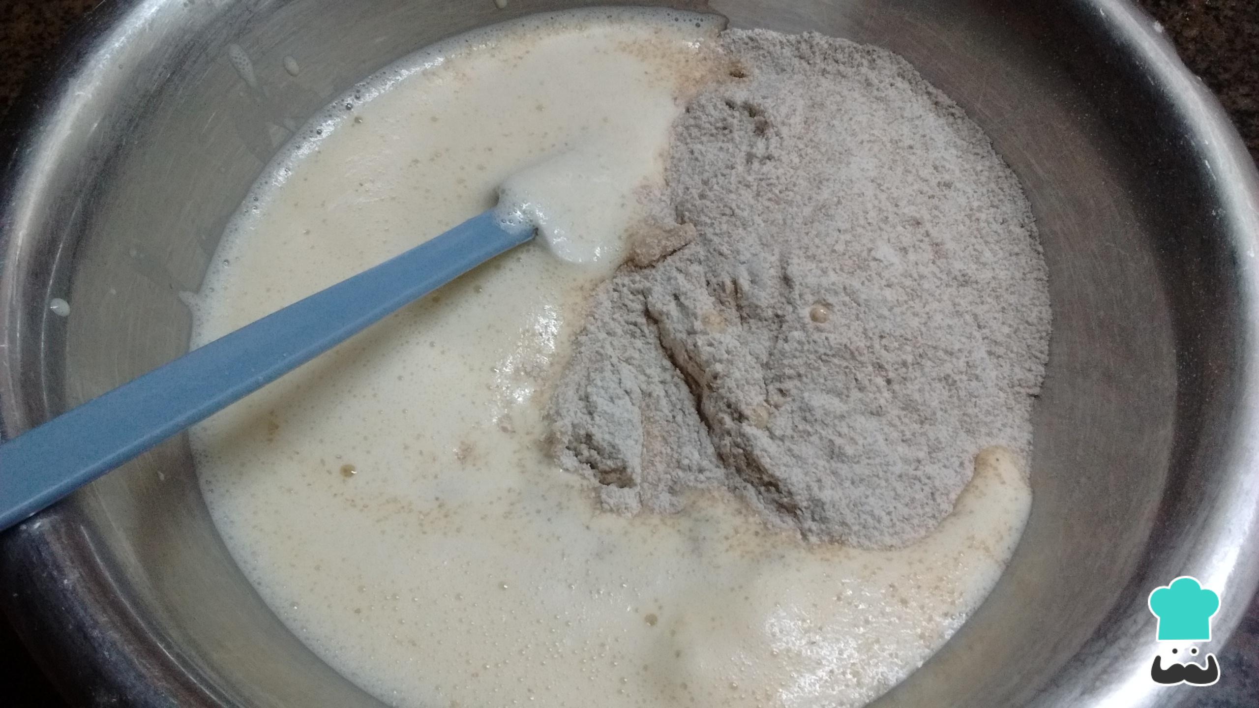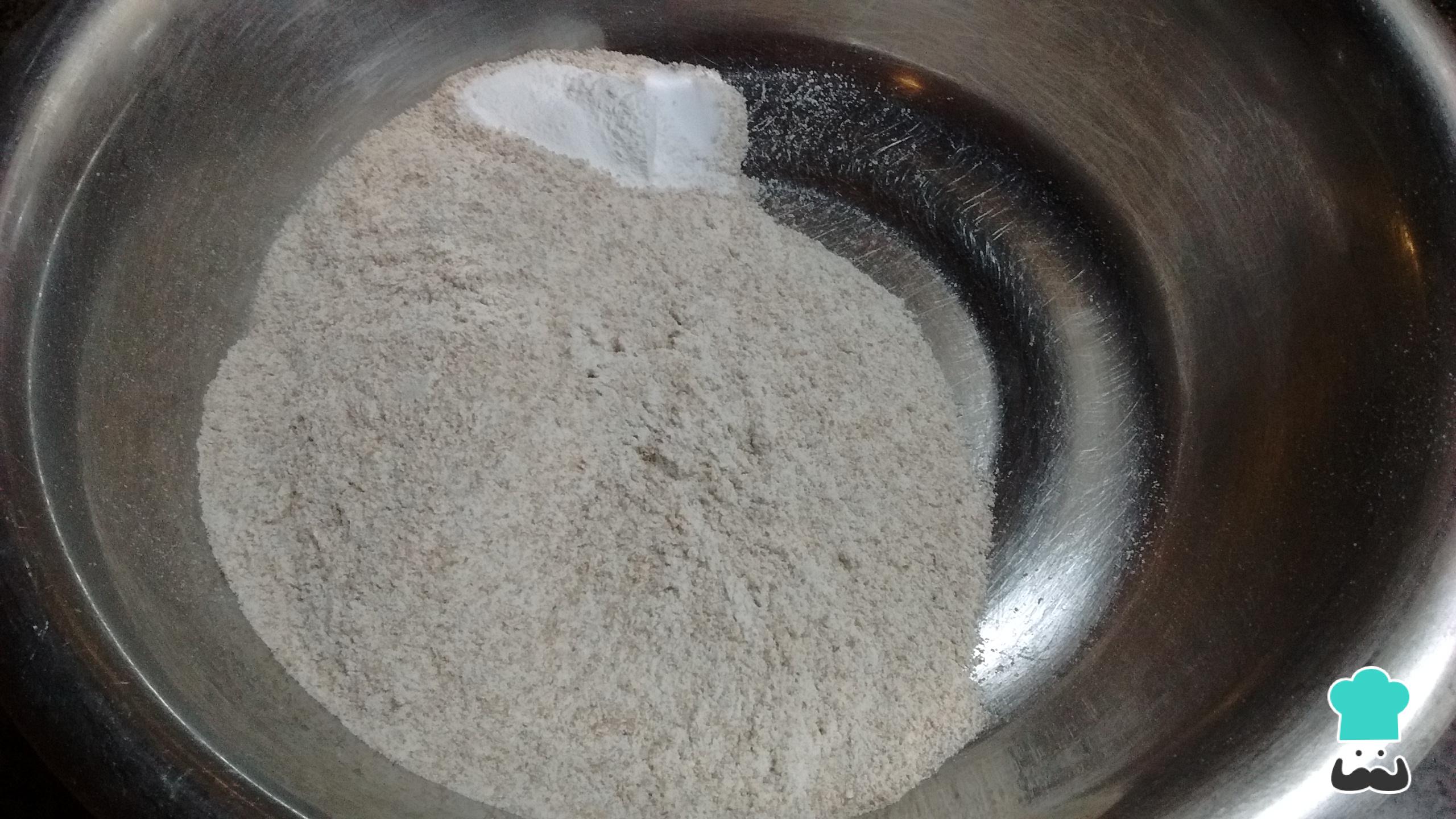 Por otro lado, prepara la harina integral, mezclándola con el polvo de hornear y el bicarbonato de sodio.