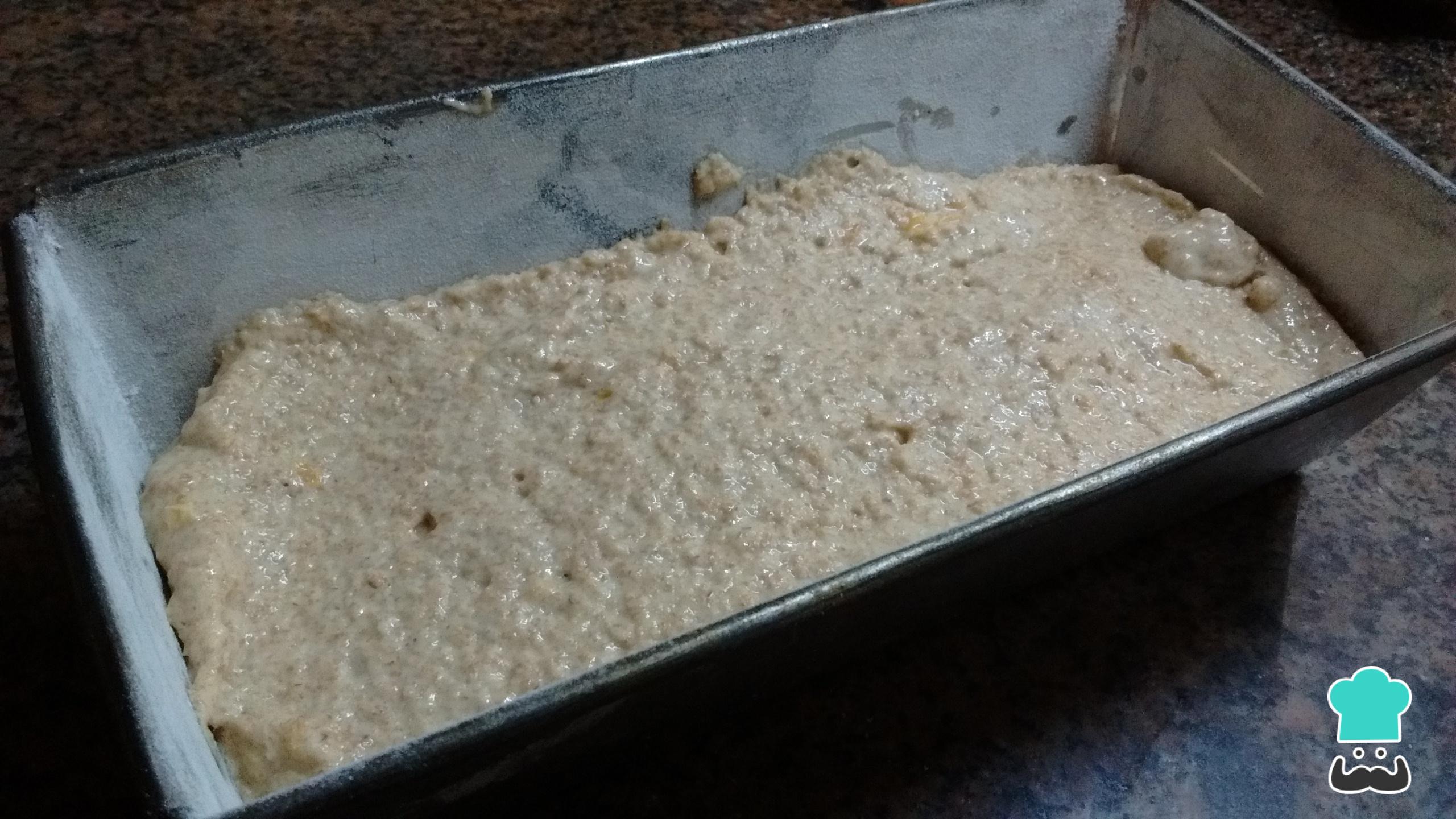 Cuando tengas la preparación de tu budín o bizcocho de mandarina húmedo, vuélcala en el molde donde desees cocinarla. Debes previamente engrasarlo y enharinarlo para poder desmoldarlo una vez listo. En este caso, el molde tiene 24 x 9 x 6 cm. Cocina el budín en el horno precalentado a 180 ºC por unos 25 minutos o hasta que, al pincharlo, no salgan restos de la preparación.