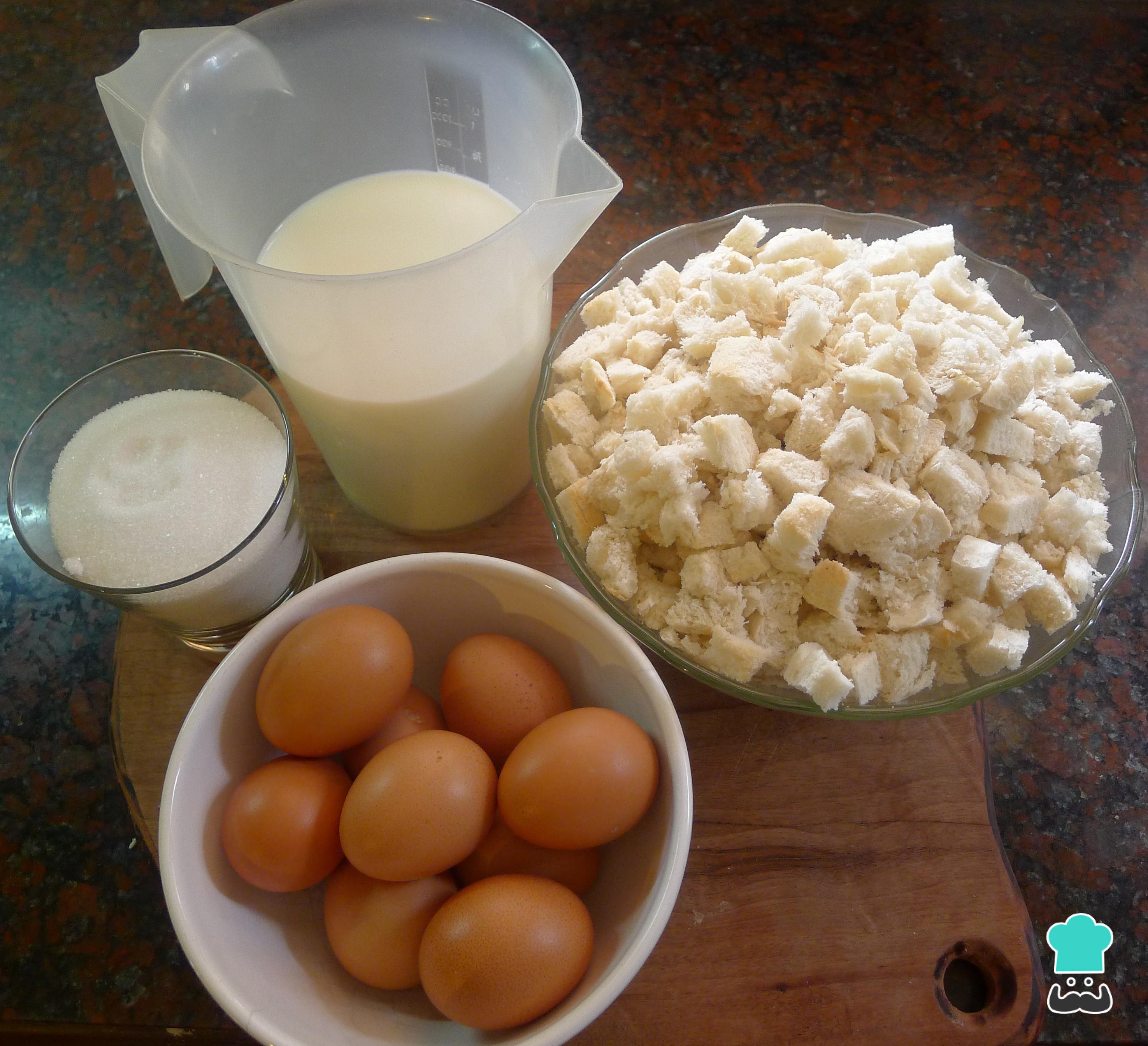 Alista los ingredientes para poder empezar a preparar la receta de budín de pan. Recuerda que lo mejor de esta receta es que podemos aprovechar la sobras de pan, así que utiliza el pan duro que tengas por casa.