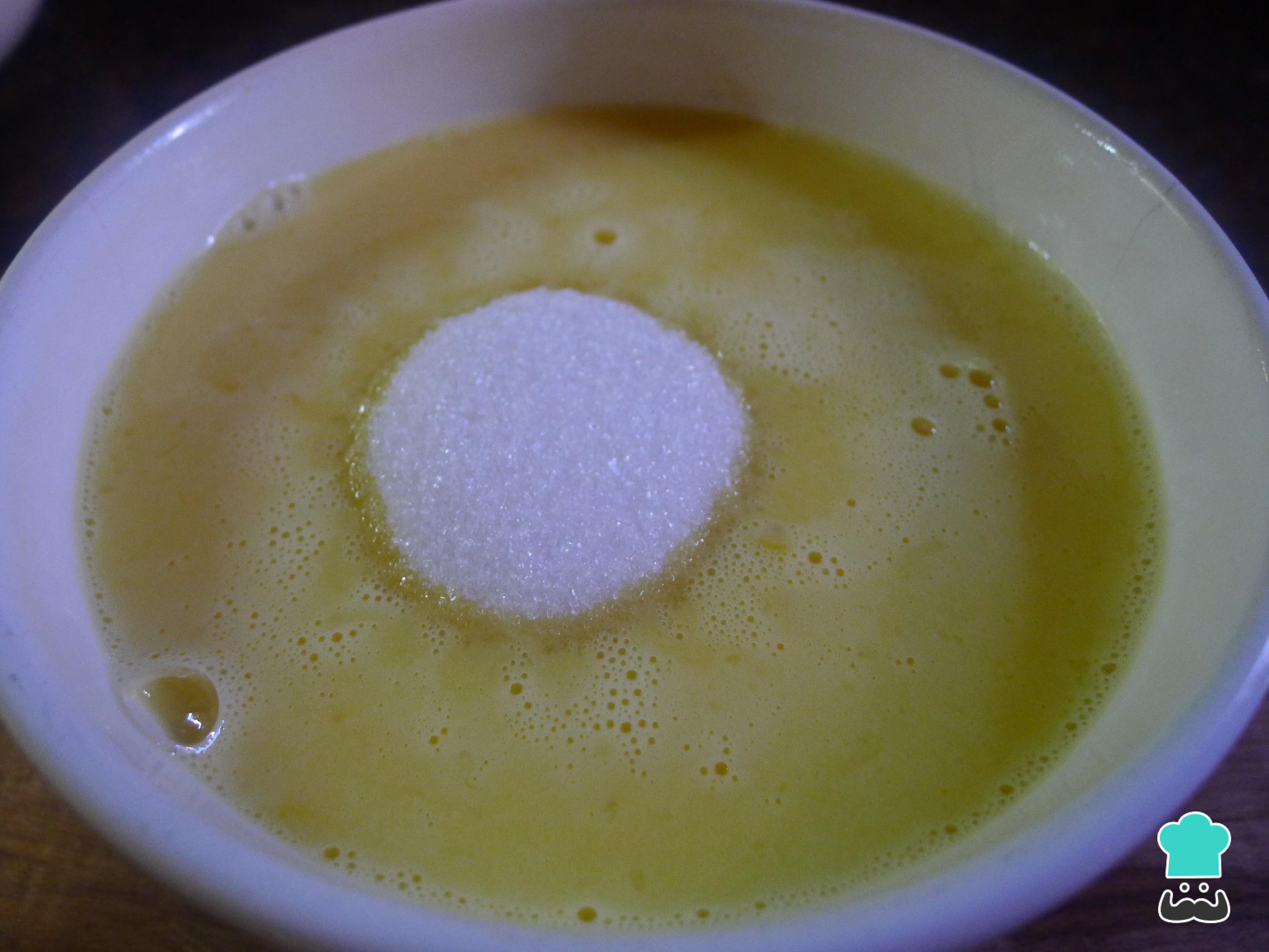 Deja el pan en remojo para que se vaya impregnando de la leche y, aparte, mezcla los huevos con el azúcar y la leche restante. Y, si quieres añadir un sabor extra a la receta de budín de pan que estás preparando, puedes agregar a esta mezcla un poco de ralladura de limón o esencia de vainilla.