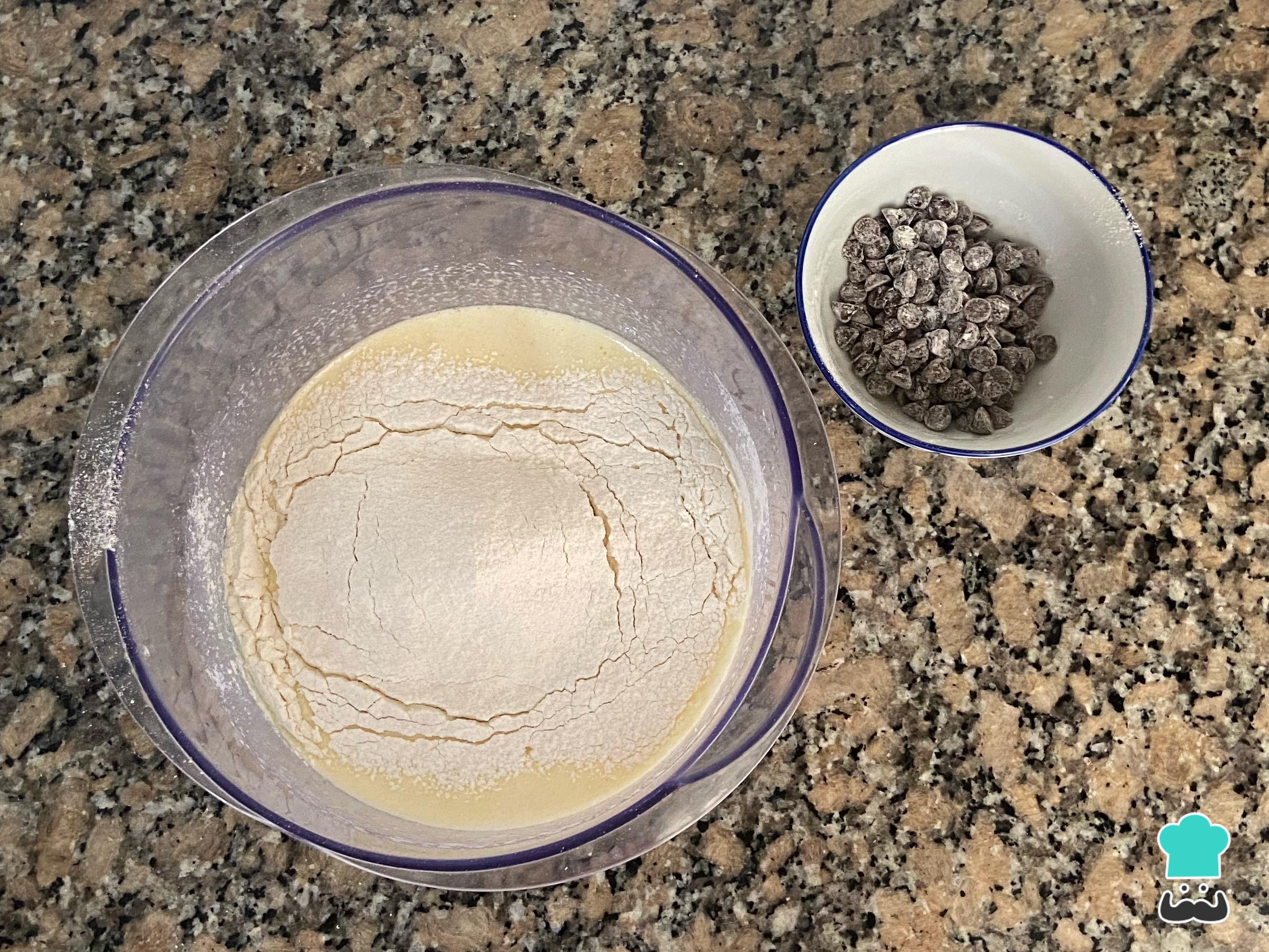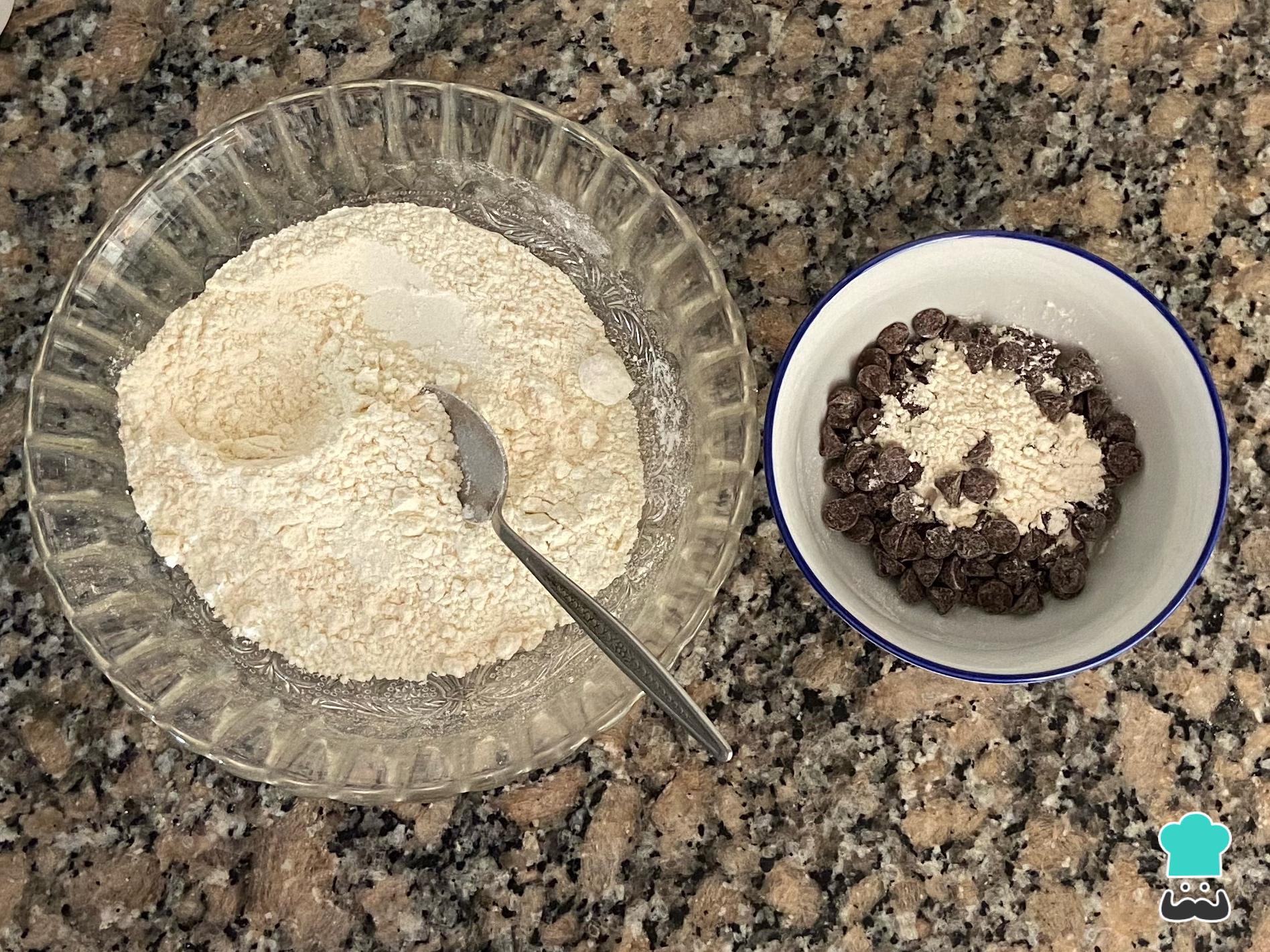 Separa 1 cucharadita de harina del total de la receta para mezclarla con los chips de chocolate y reserva.