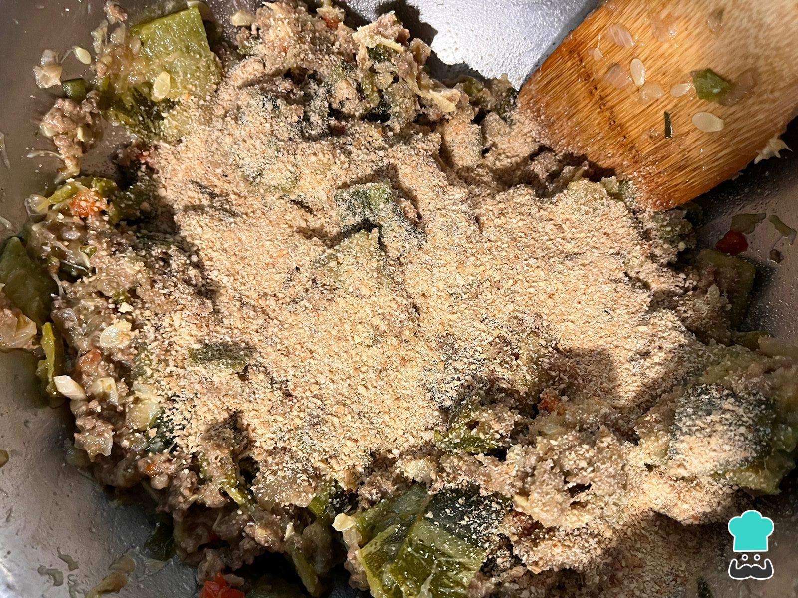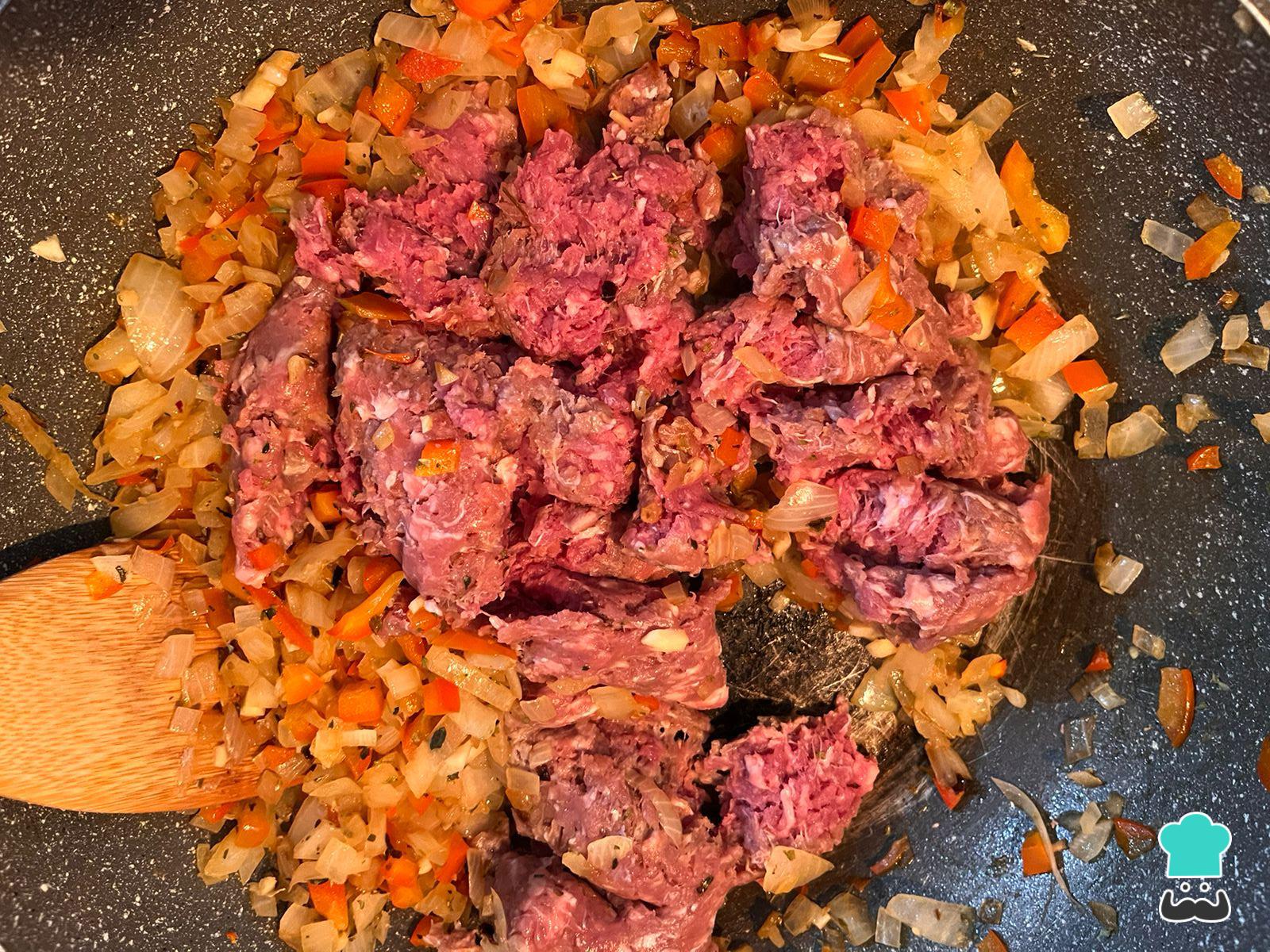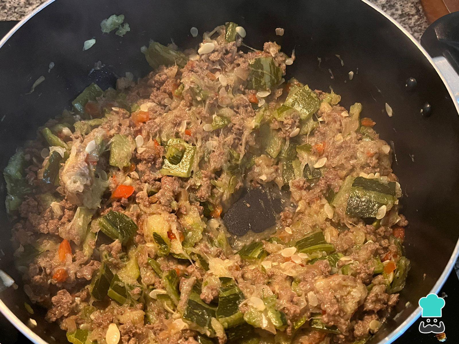 Cuando el exceso de agua del zapallo italiano se haya evaporado, apaga el fuego y añade la carne molida, integra bien.