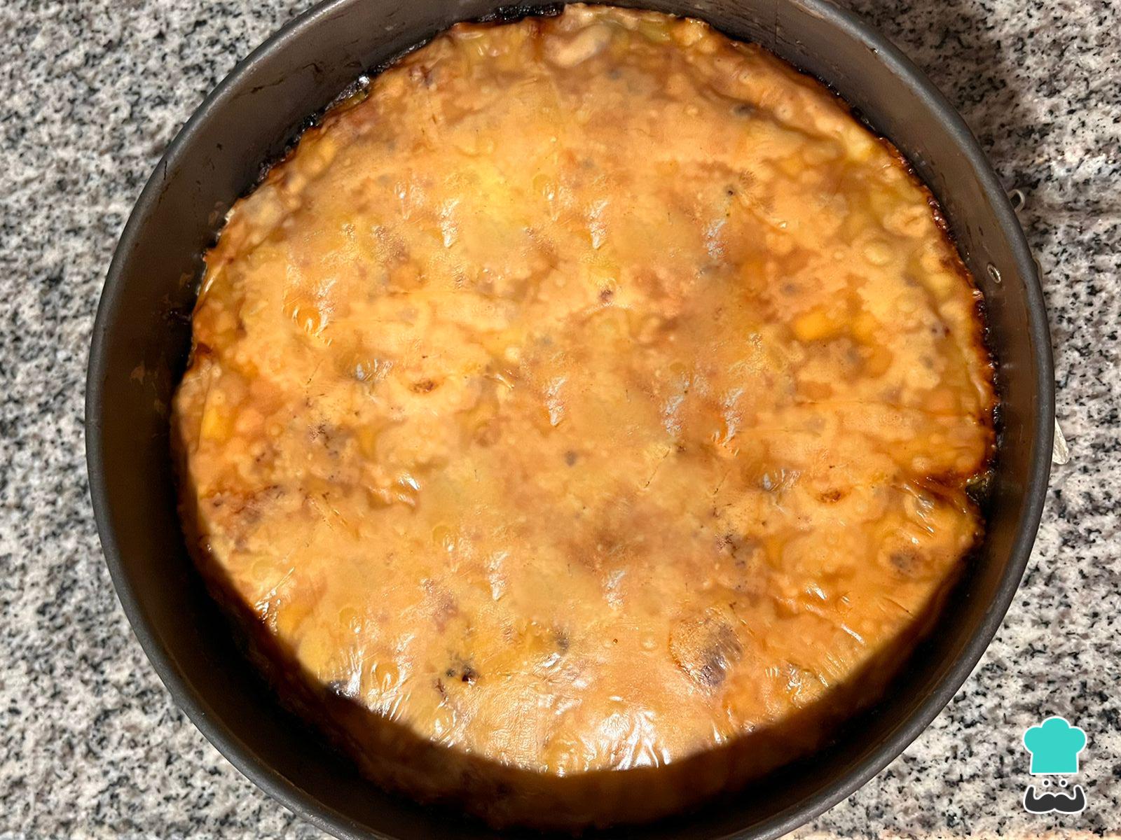 Lleva al horno precalentado a 180 °C por unos 30-35 minutos, o hasta que el budín esté firme y dorado por encima.