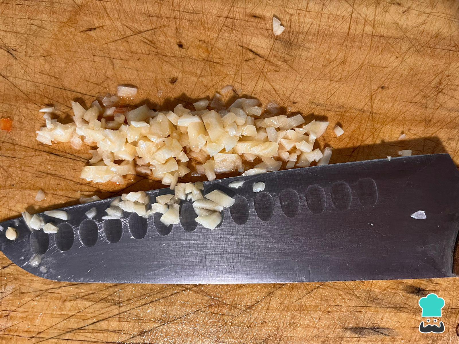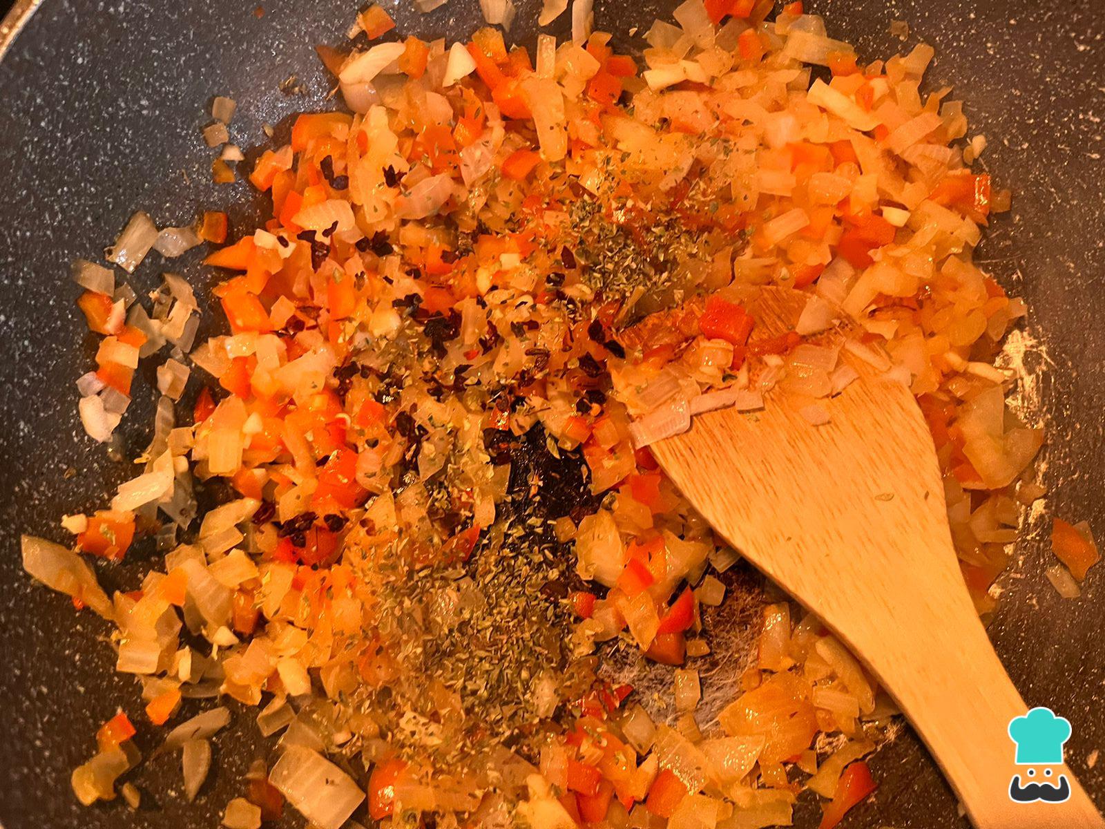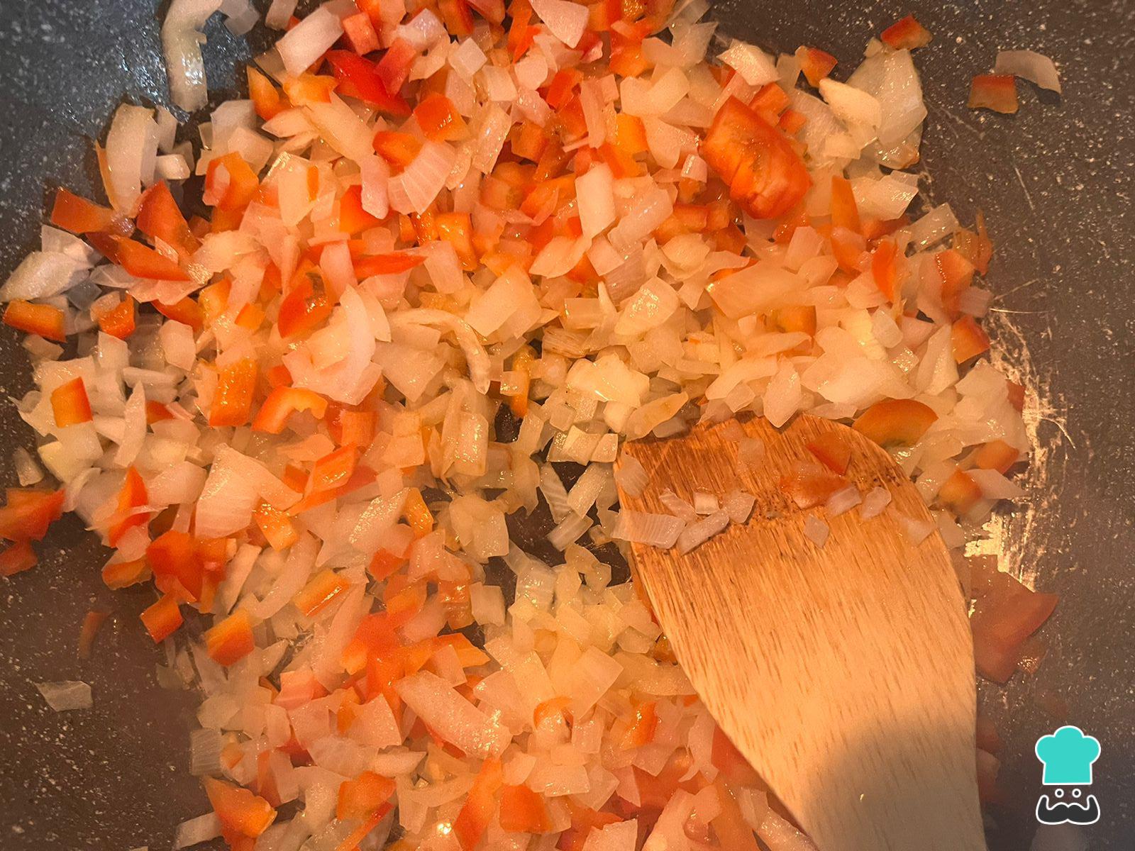 Cuando la cebolla esté un poco transparente, añade el pimentón y el ajo.