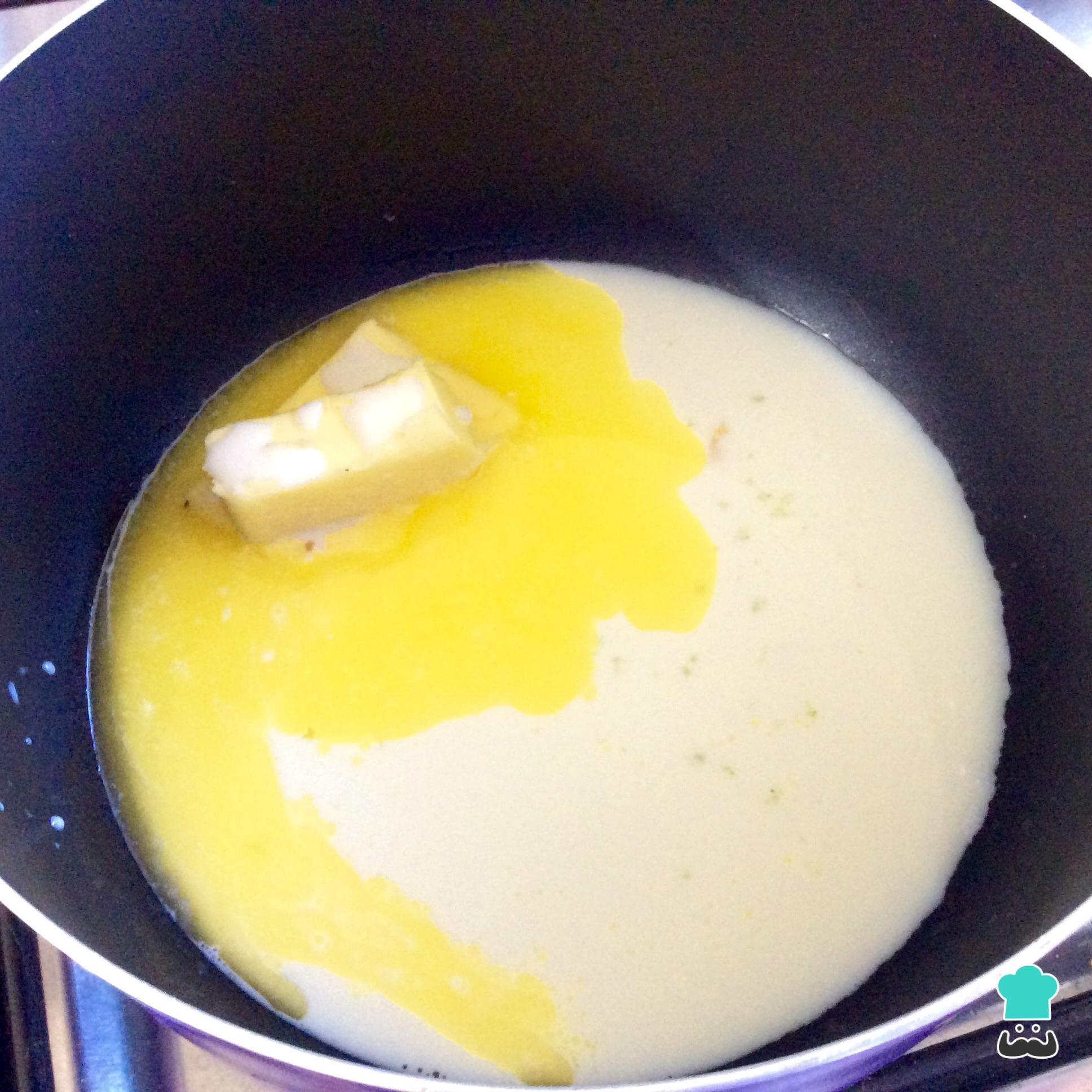 Coloca los 45 mililitros de leche en una olla mediana, agrega la mantequilla, 10 gramos de azúcar normal o moreno y un chorro de esencia de vainilla. Calienta esta mezcla a fuego alto hasta que la mantequilla se derrita y comience a hervir.