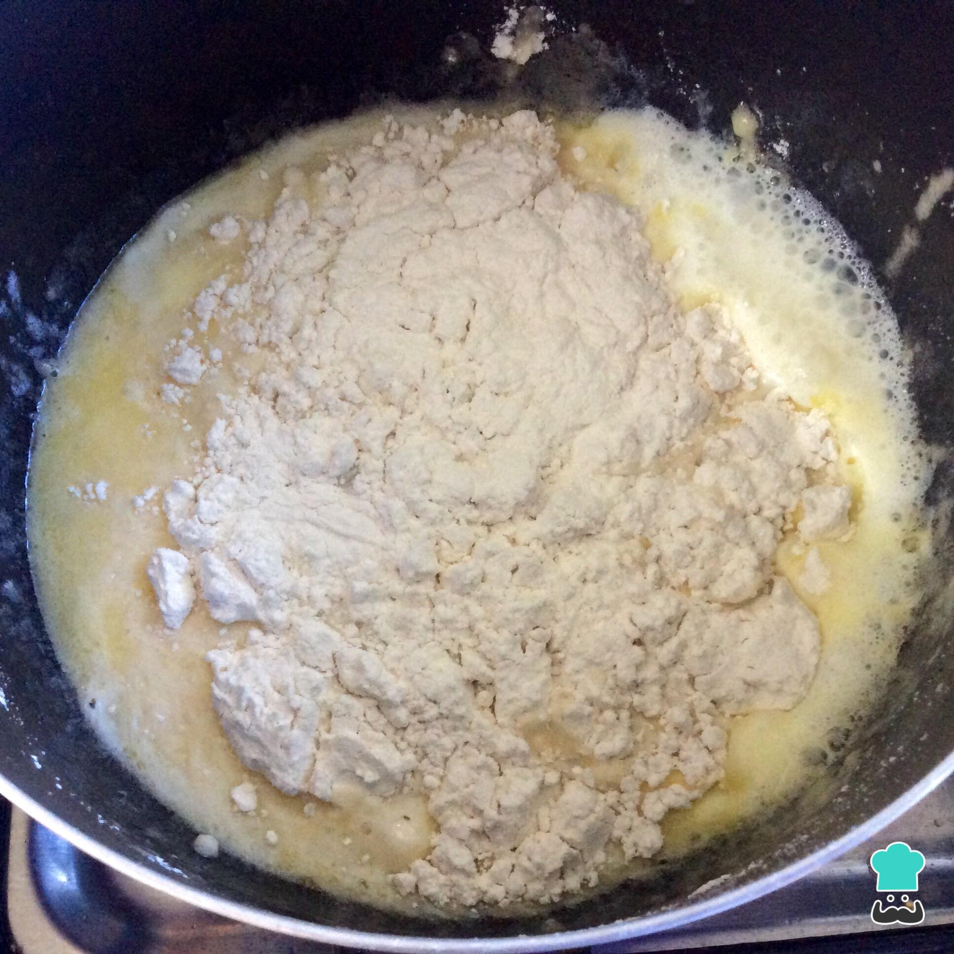 Cuando la mezcla de la leche esté hirviendo agrega la harina de golpe y sigue mezclando vigorosamente.