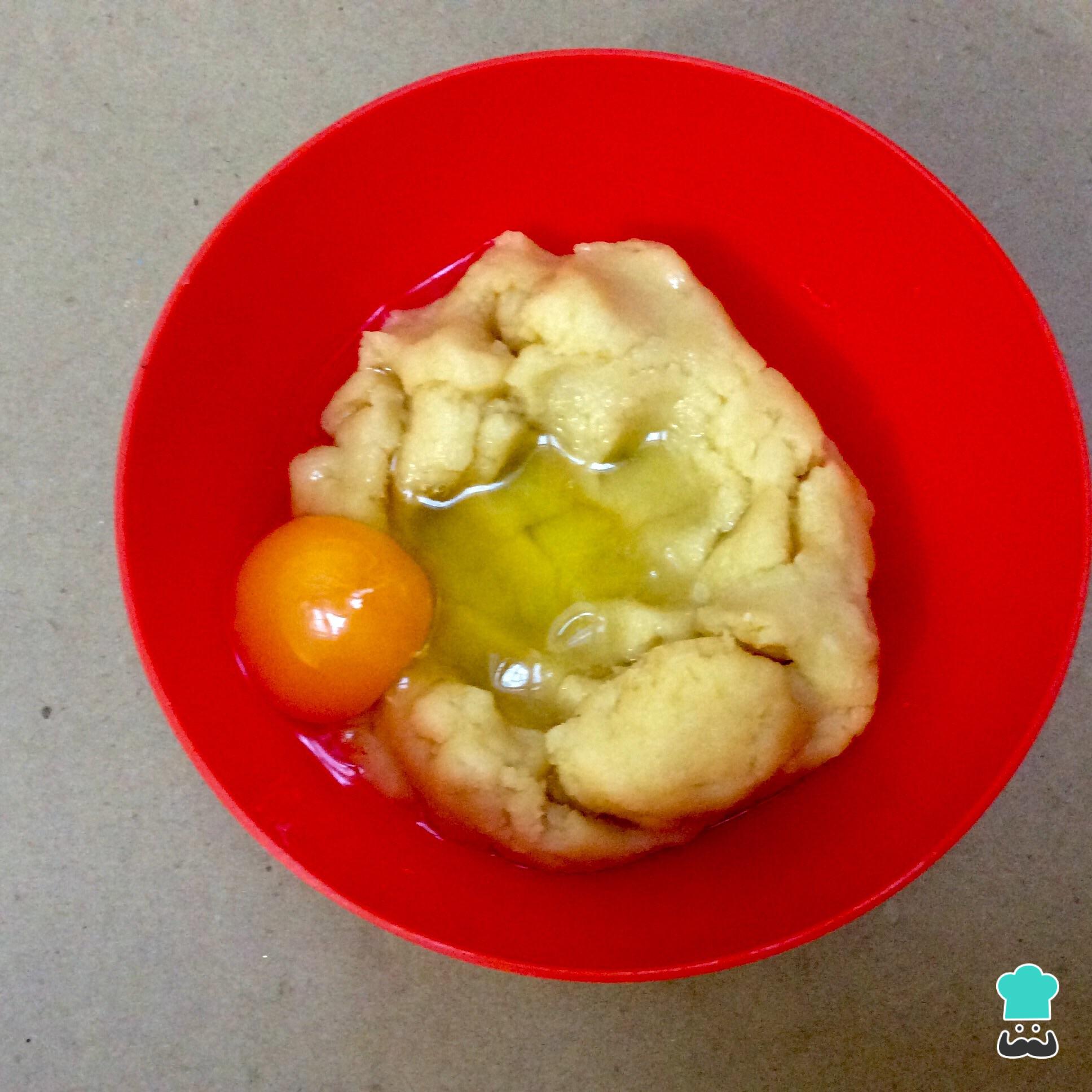 Cuando la masa esté muy fría agrega 2 huevos y bate muy bien, la mezcla para los buñuelos con crema pastelera debe quedar espesa y un poco pesada, pero no debe quedar líquida.