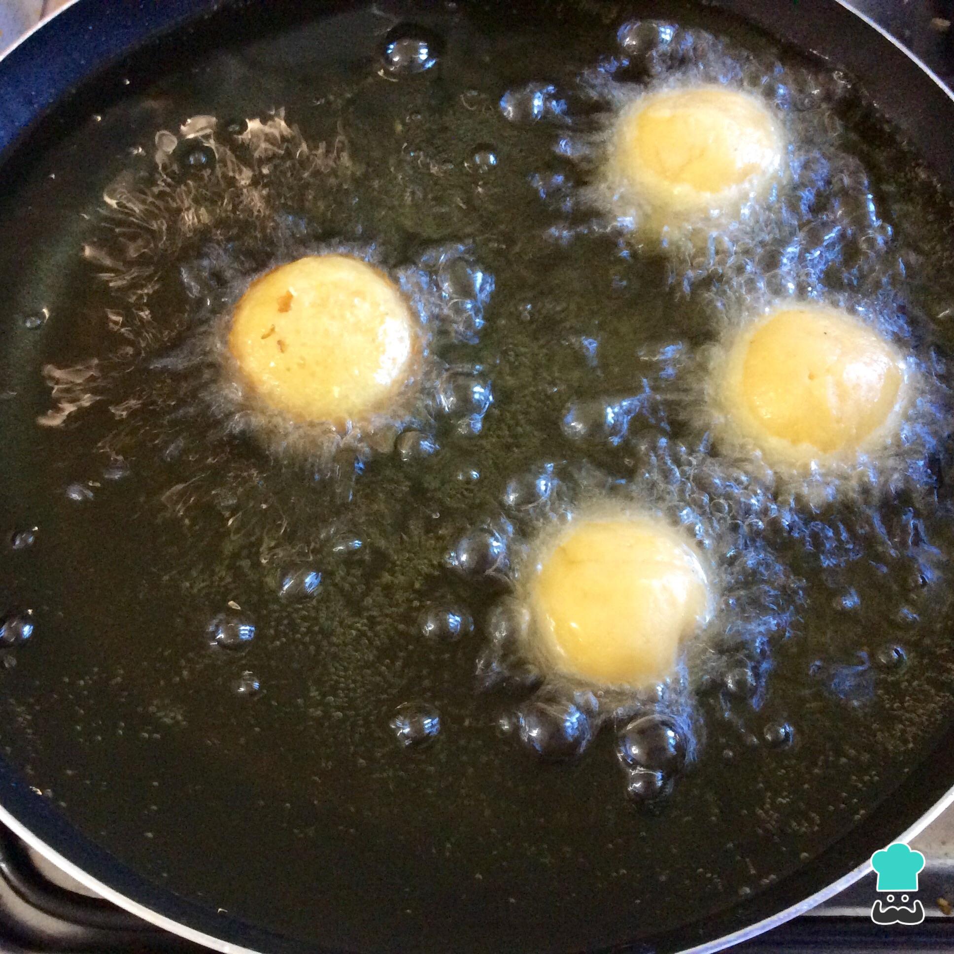 En una sartén grande coloca suficiente aceite para freír, cuando esté hirviendo baja el fuego a medio y fríe los buñuelos hasta que estén bien dorados.