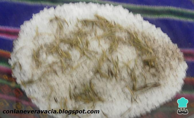 Precalienta el horno a 240ºC. En una bandeja apta para horno pon una capa de sal gorda, reparte unos trozos de romero y una pizca de pimienta negra molida.