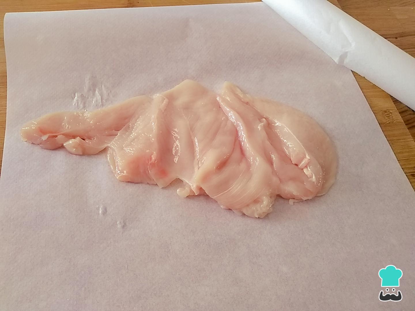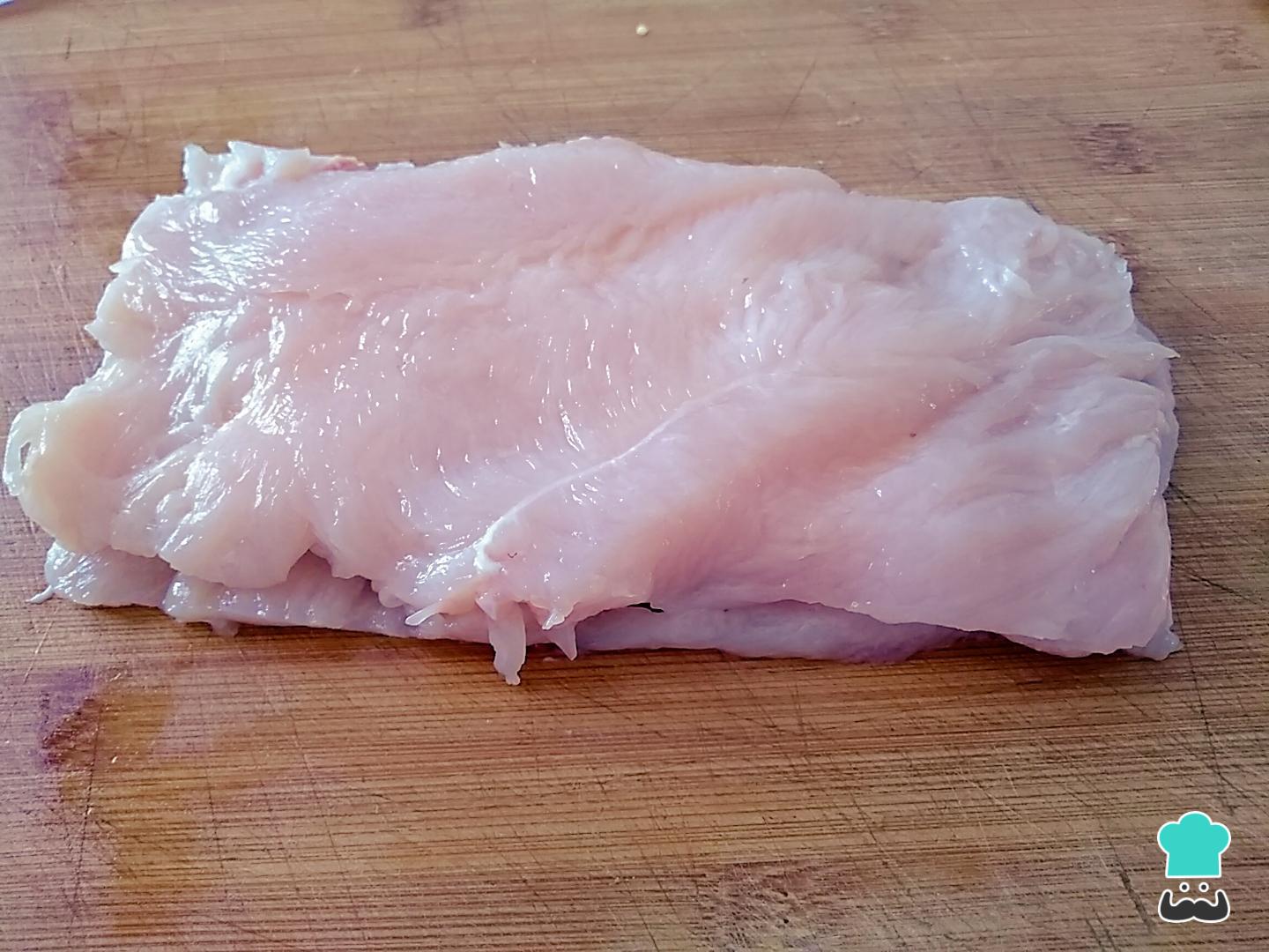 Prepara cuatro filetes de pechuga. Independientemente de la cantidad que quieras preparar, siempre deberán ser pares para poder empanar los filetes.