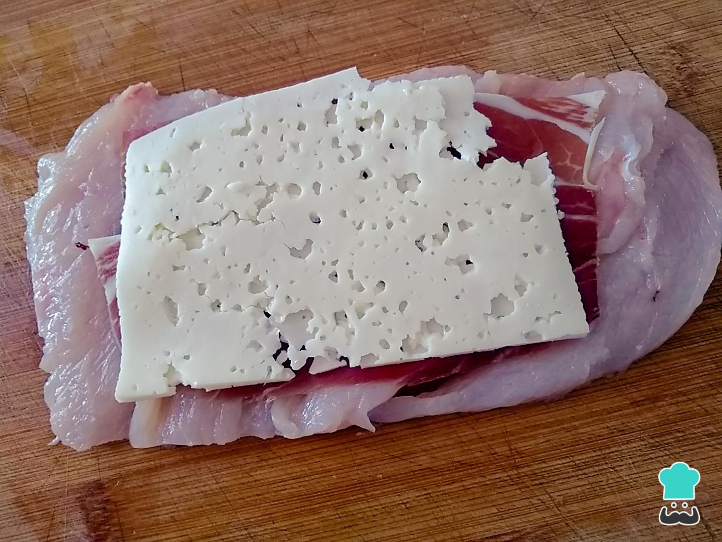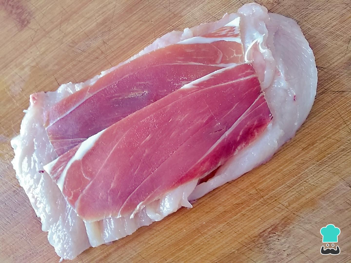 Una vez tengas dos piezas de pollo alineadas y del mismo tamaño, coloca dos lonchas de jamón serrano en uno de los filetes. Corta las esquinas las lonchas de jamón para que queden rectangulares.