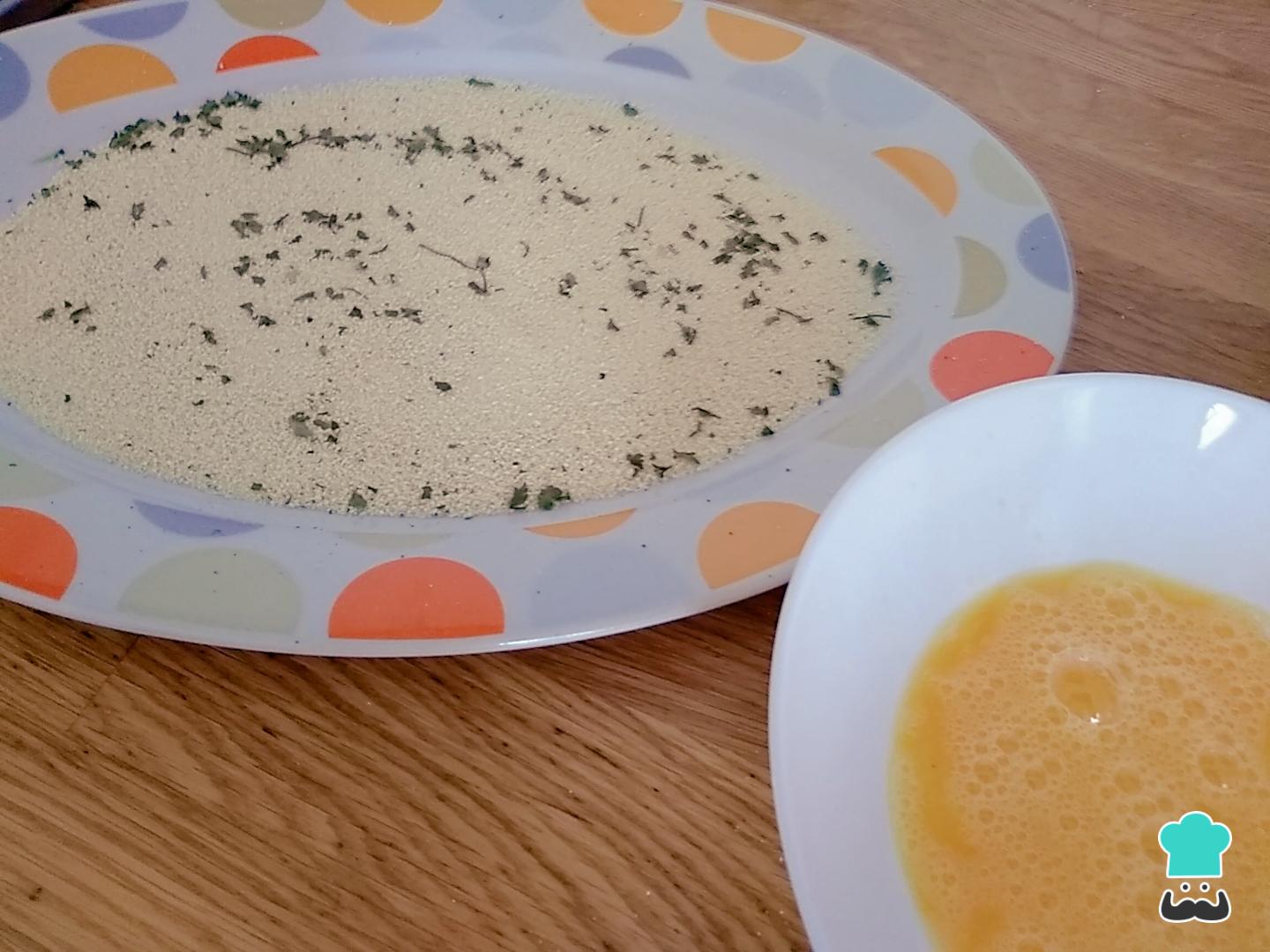 Bate un huevo hasta que quede mezclado, pero no cuajado. Añade un pequeño pellizco de sal y coloca, en otro recipiente, el pan rallado.