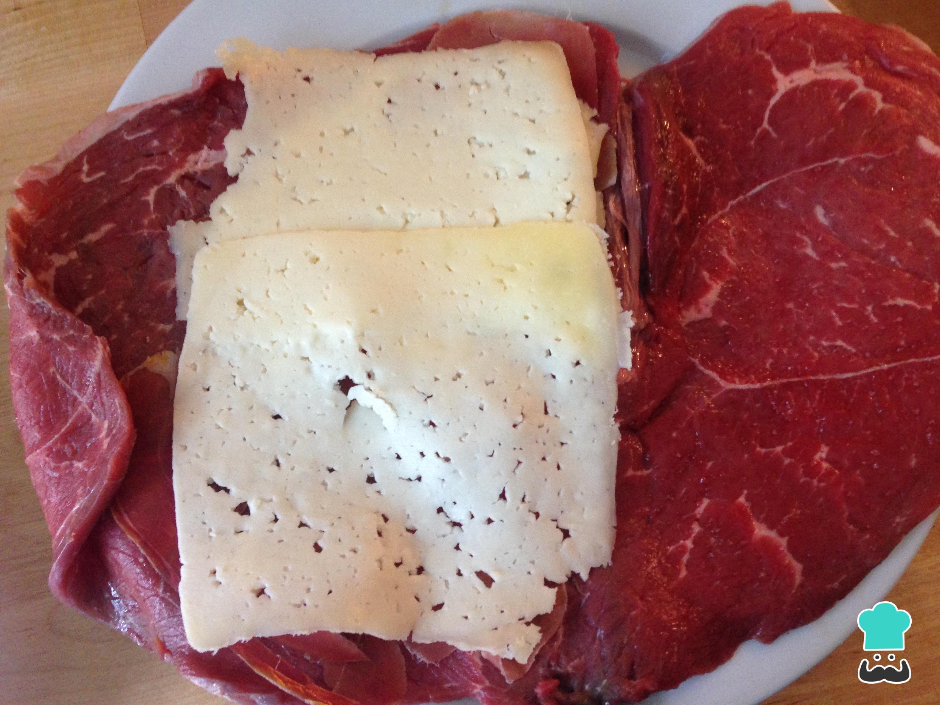 Colocamos el queso sobre las lonchas de jamón serrano y cerramos el cachopo. No hace falta cerrar el cachopo con ninguna cuerda, simplemente lo cerramos como si fuera un libro. ¿Con qué queso se hace el cachopo? Lo cierto es que el tipo de queso va con el gusto del consumidor, de manera que podemos utilizar le que más nos guste, siempre y cuando sea apto para fundir.
